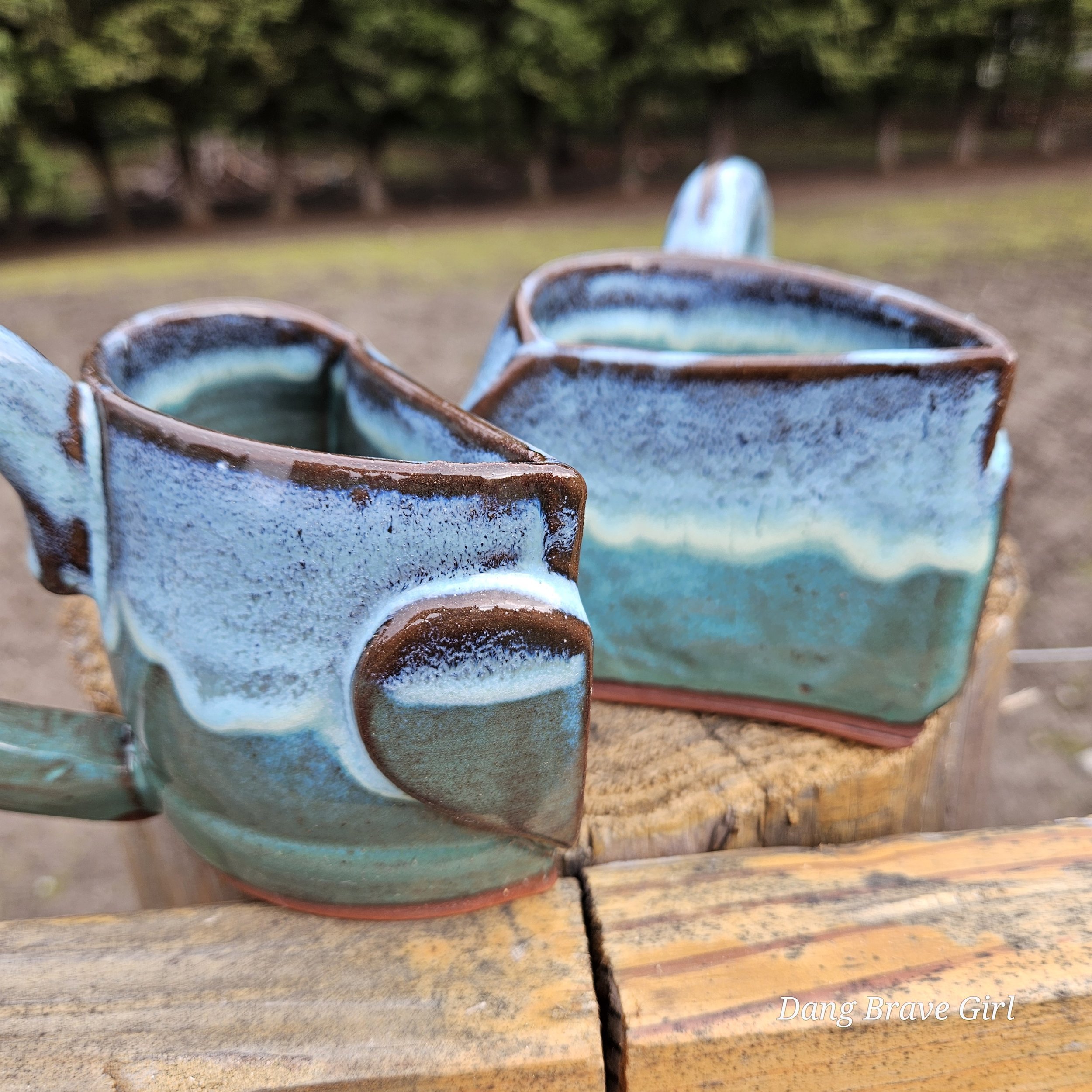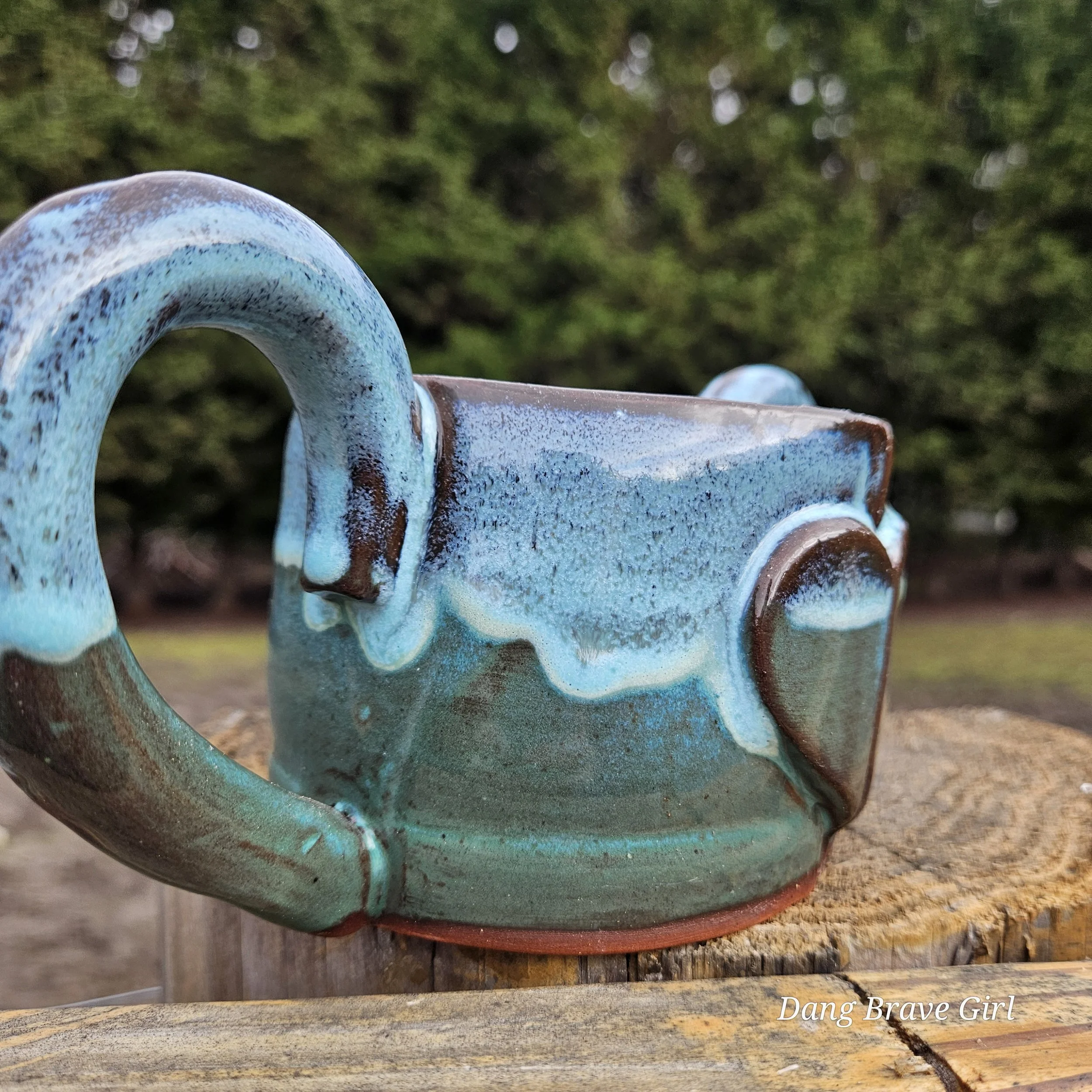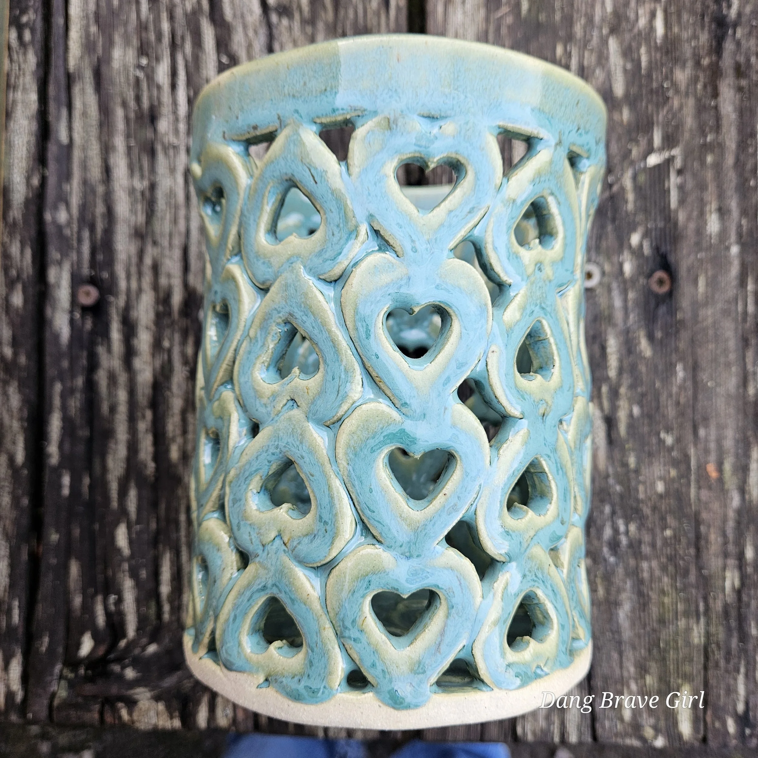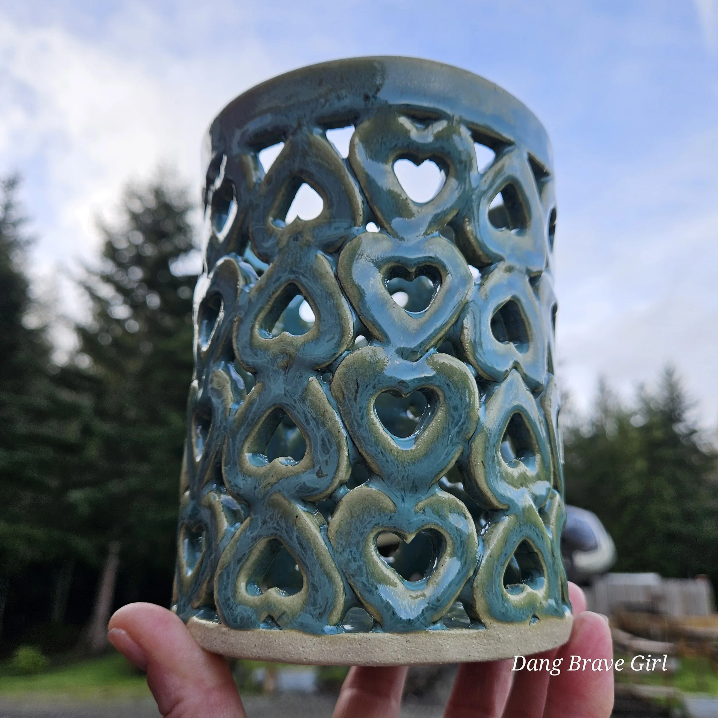 Handmade by the DBH with a creamy white stoneware, this heart shaped mug is hand painted with different colored hearts all the way around. It’s even got a surprise at the bottom of the mug on the inside! Highlighted with my new favorite glaze….fairy dust!