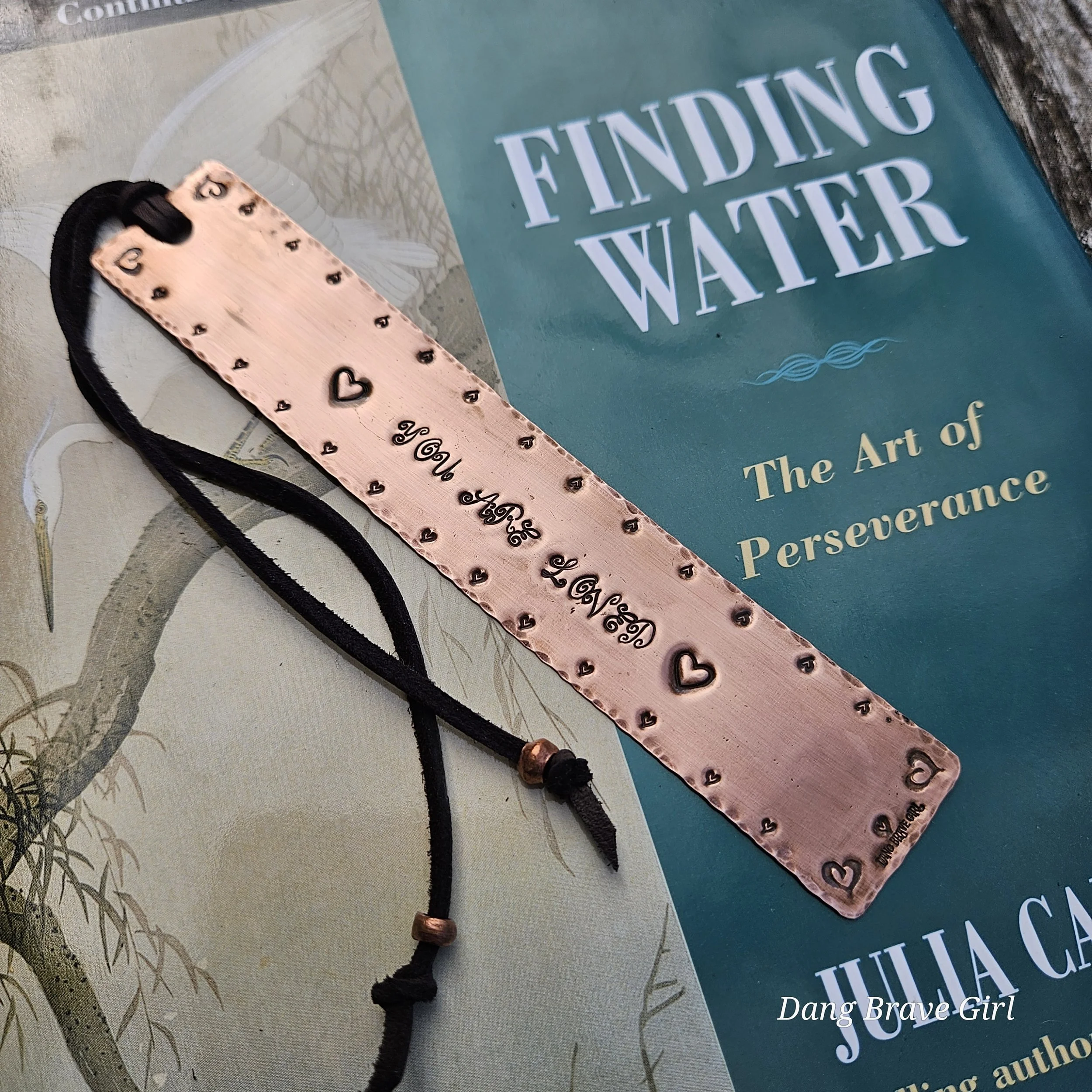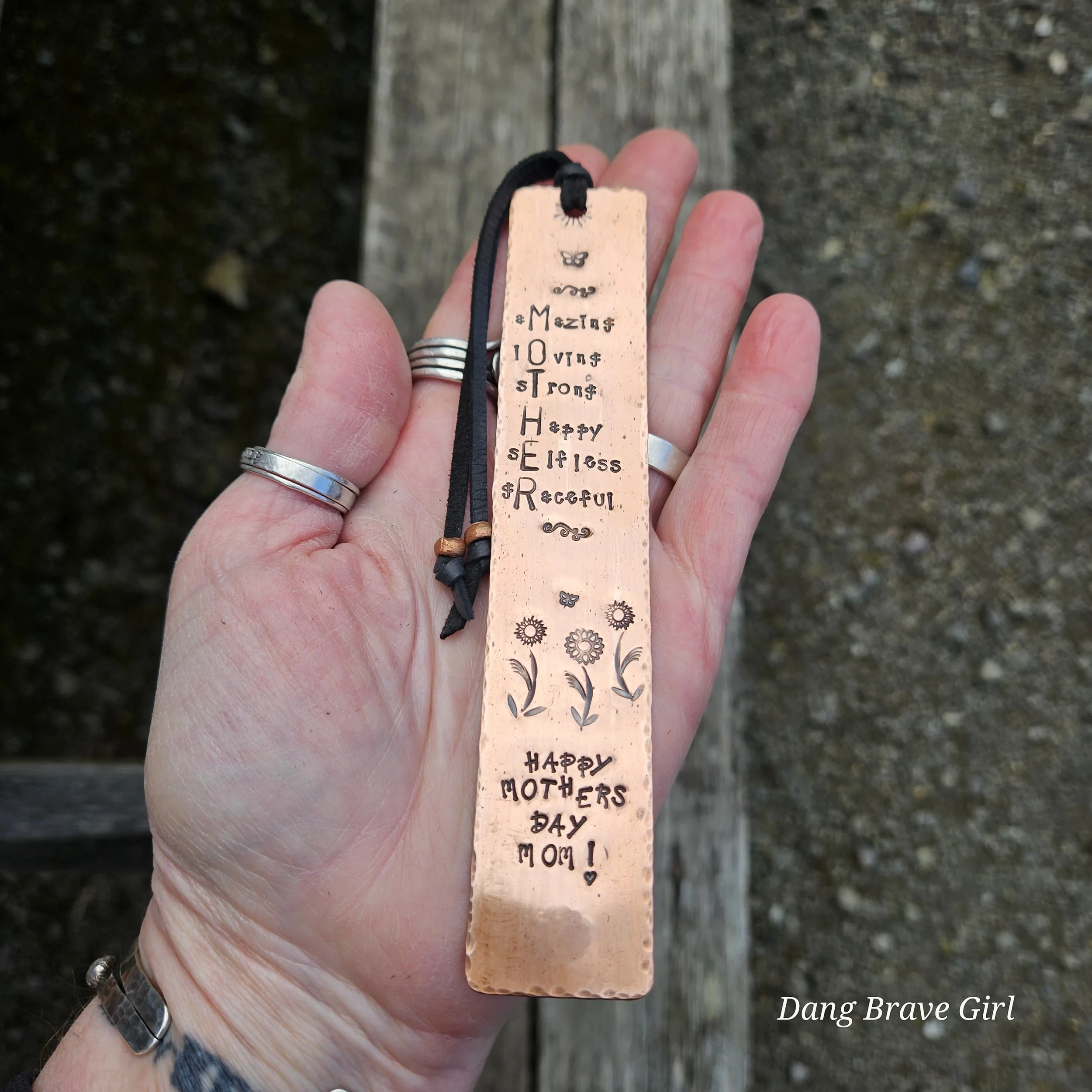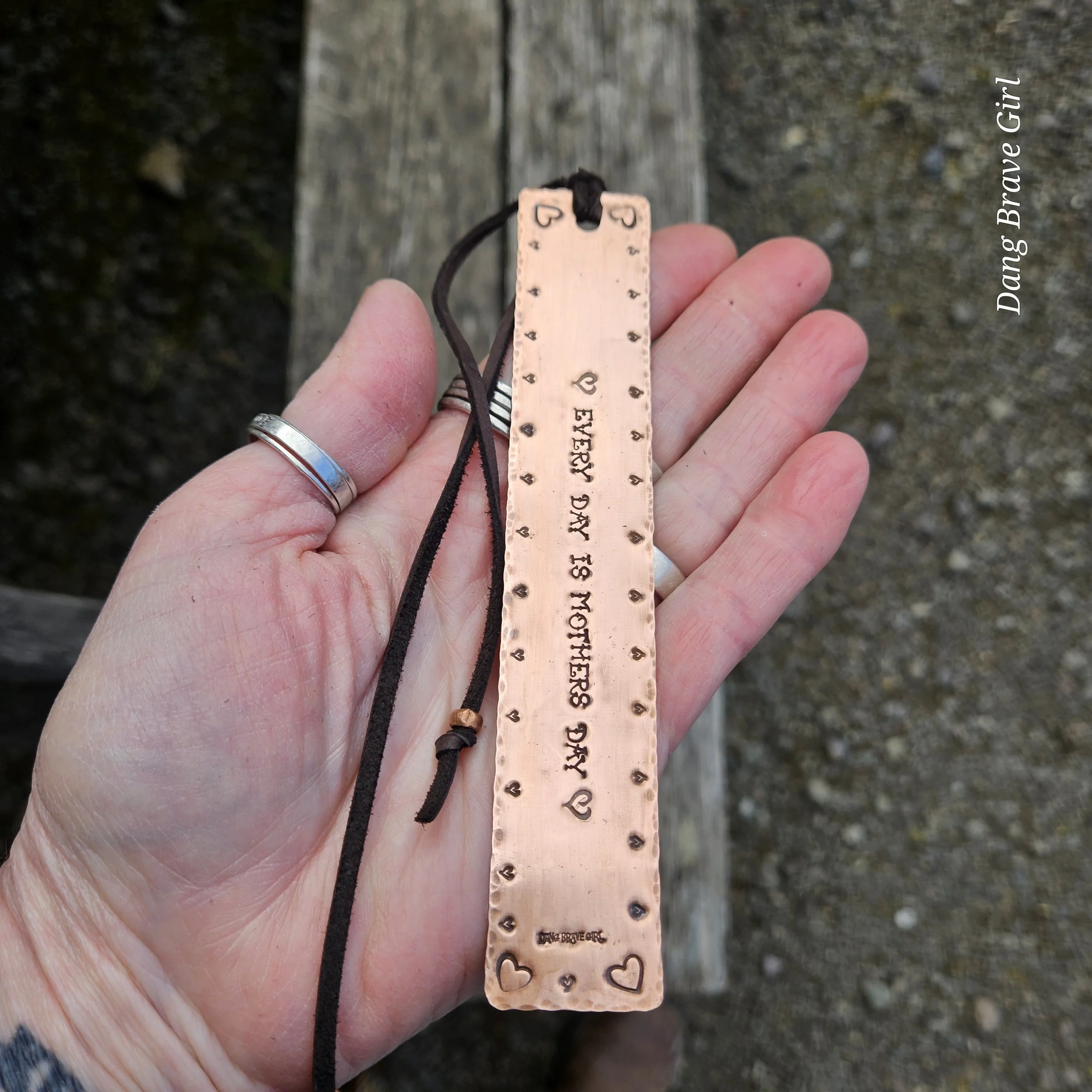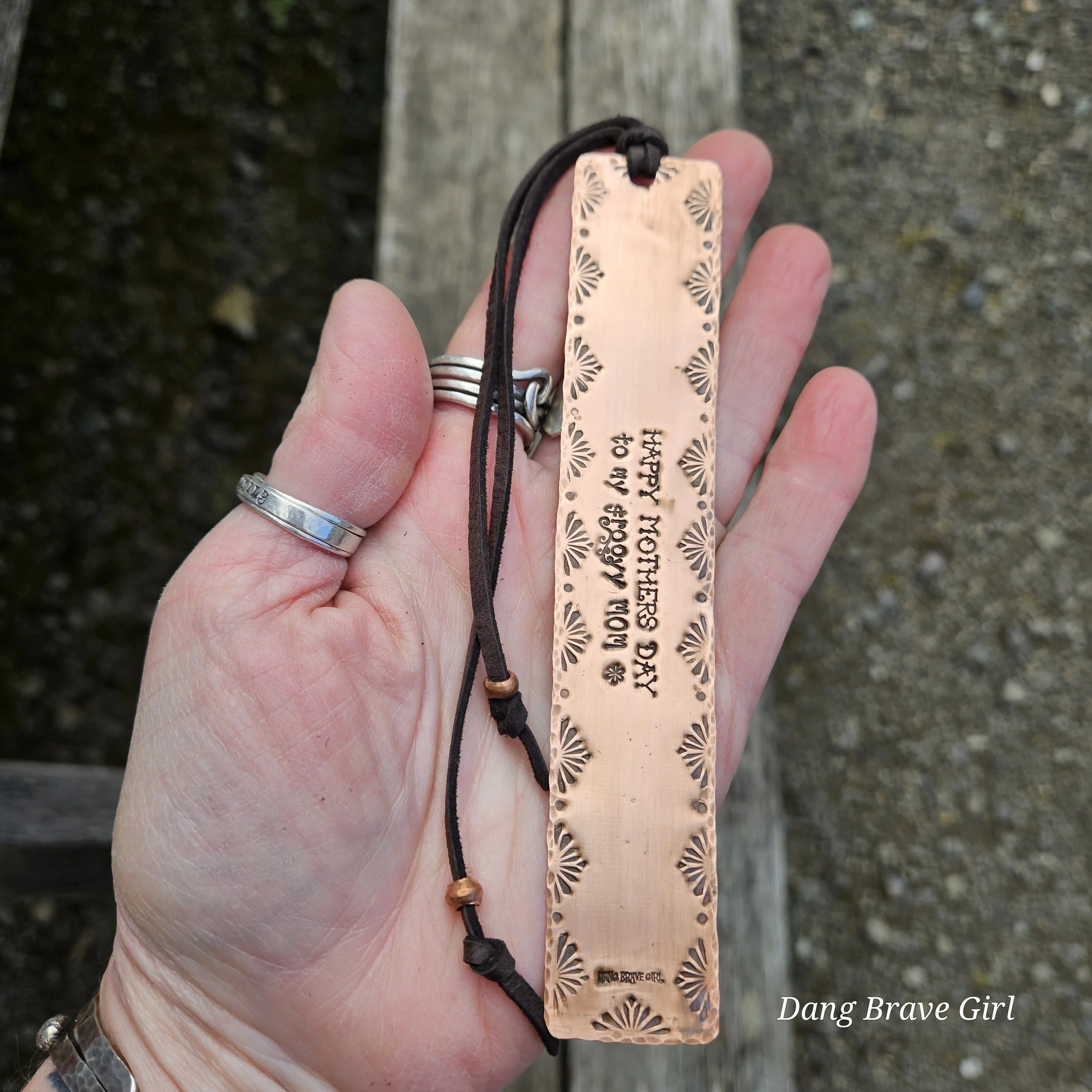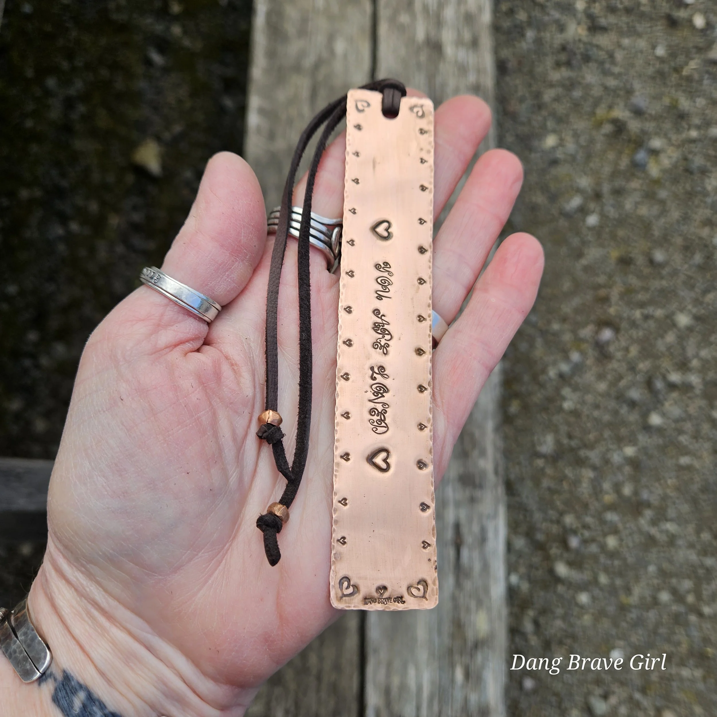 These hand stamped sweet sentiments of love are made of copper, leather and copper beads.