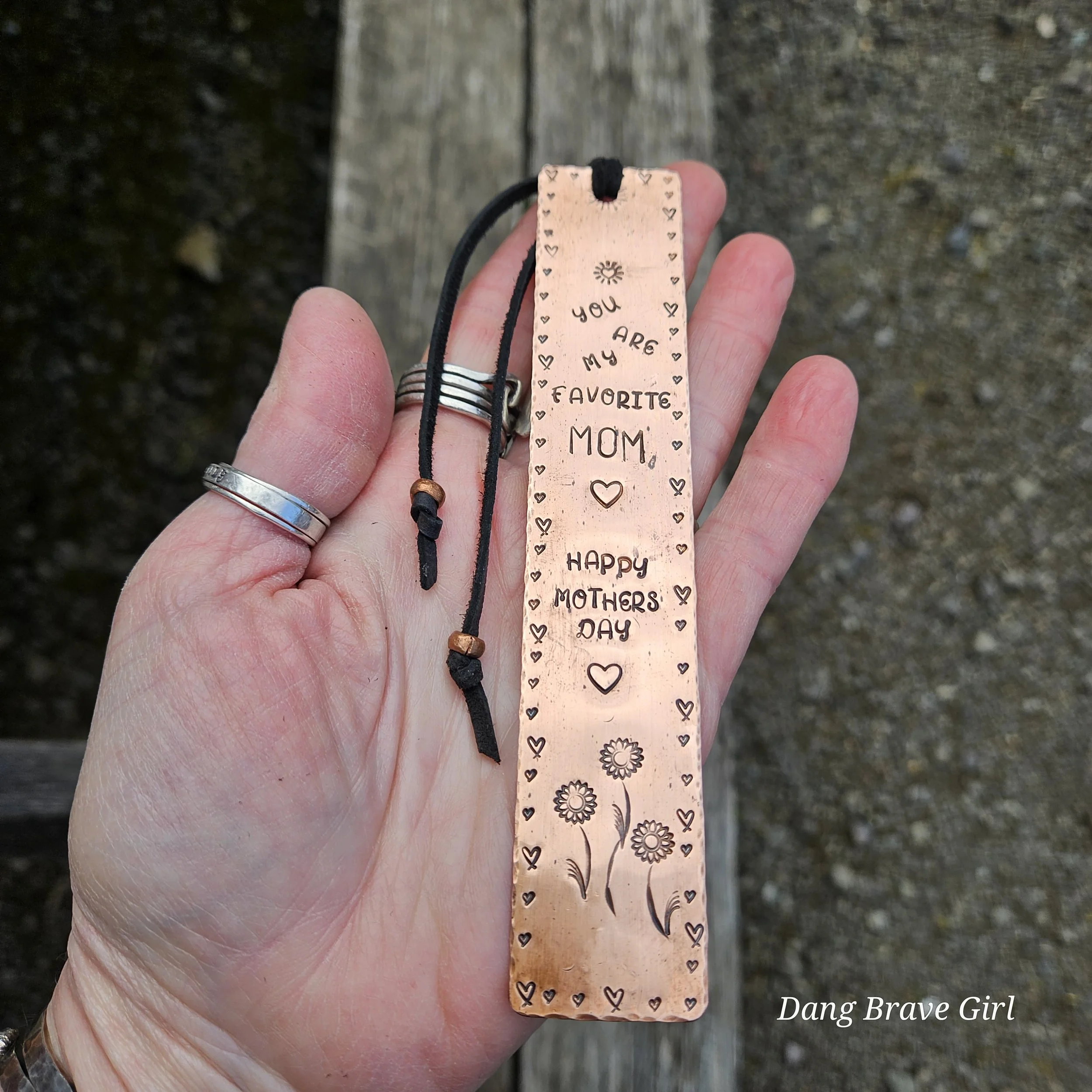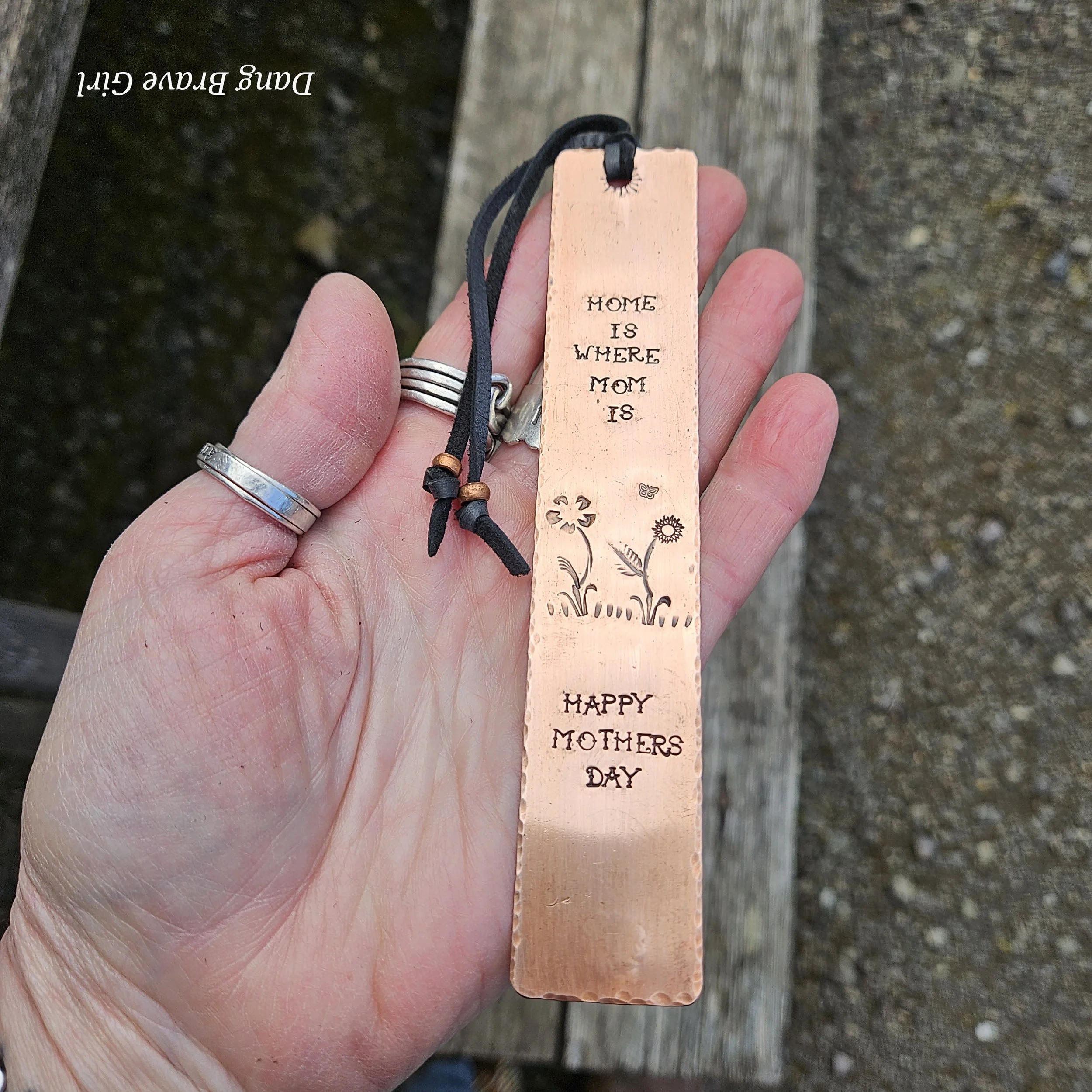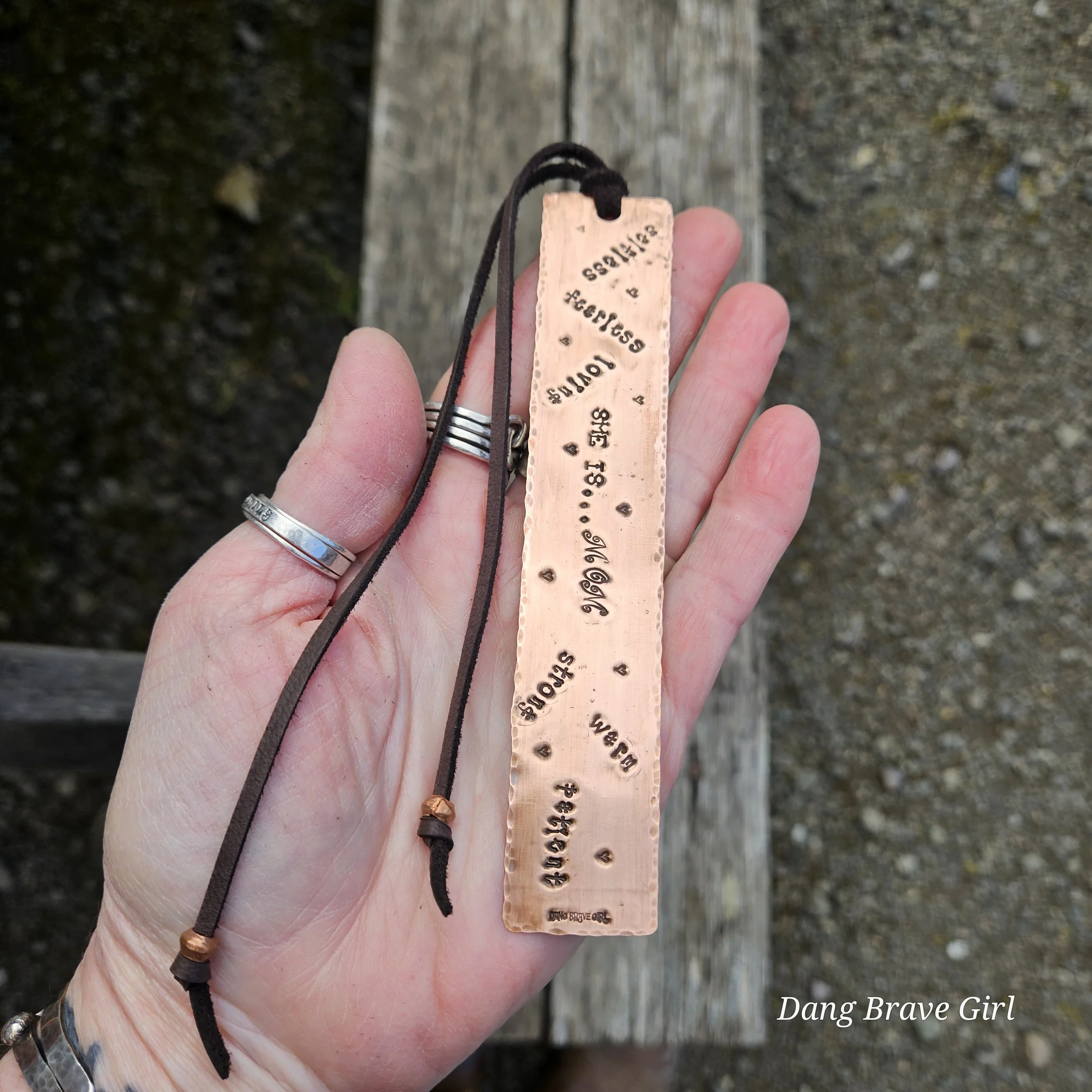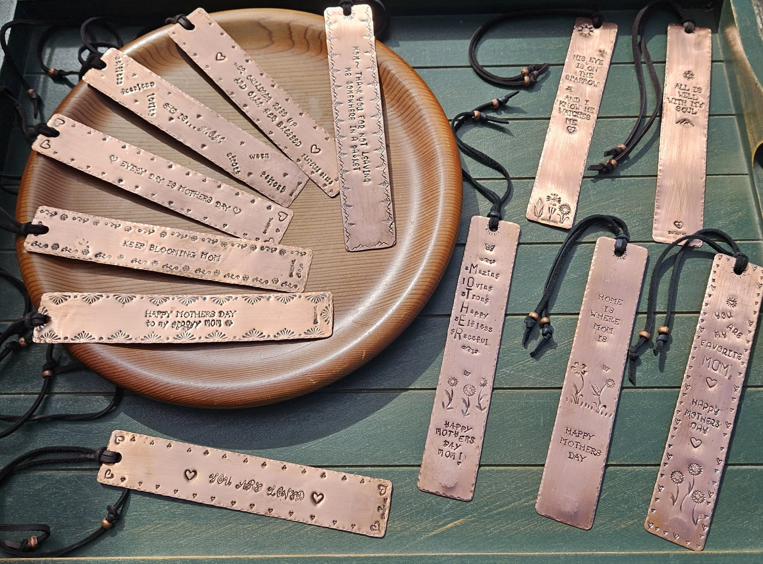 They measure 6” - 6 1/2” long and are 1” - 1 1/4” wide. Leather tassels are 4” - 6” long. The finished bookmarks were given a protective coating to help them from tarnishing but with time and regular use, they may take on the gorgeous patina copper is loved for.