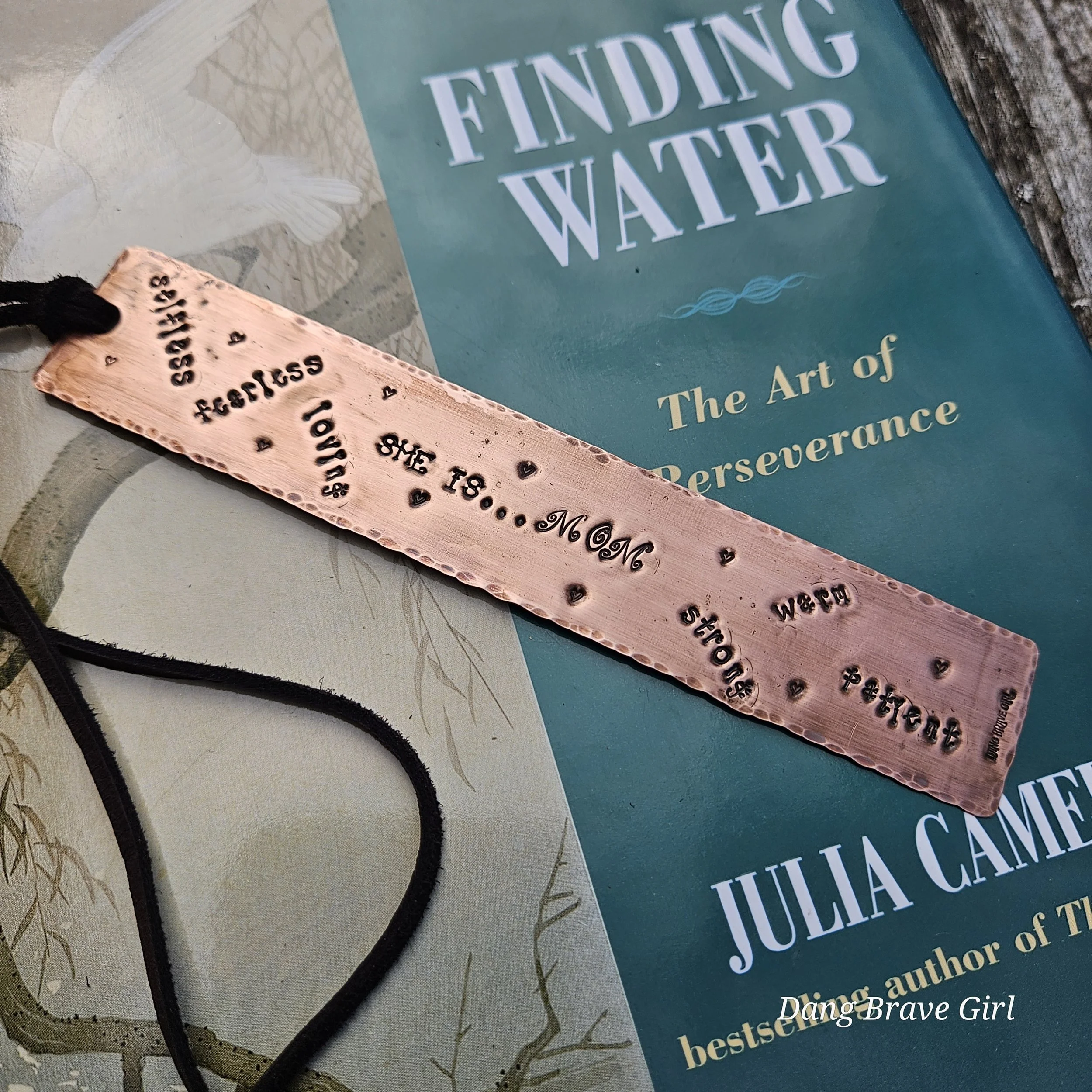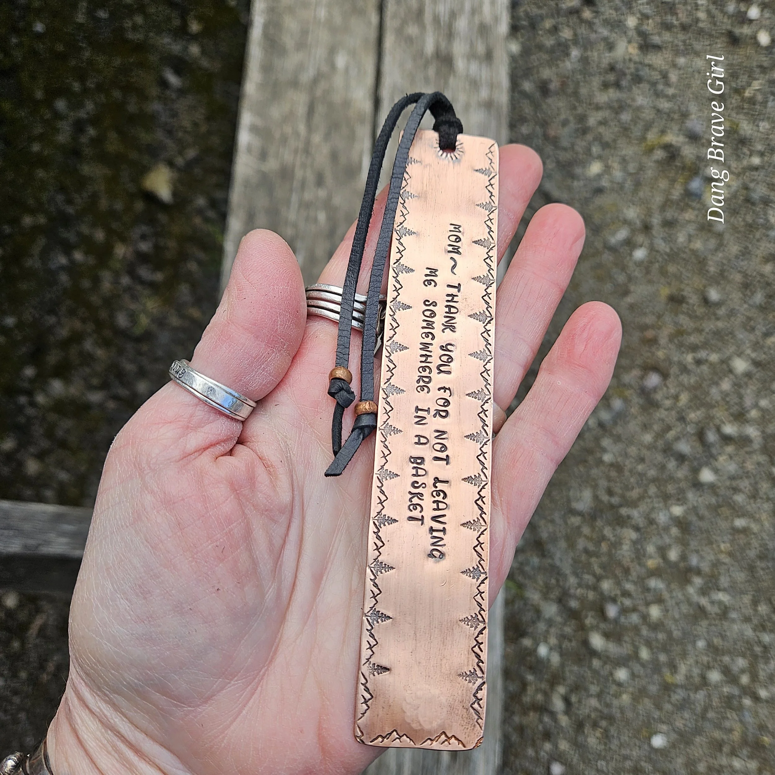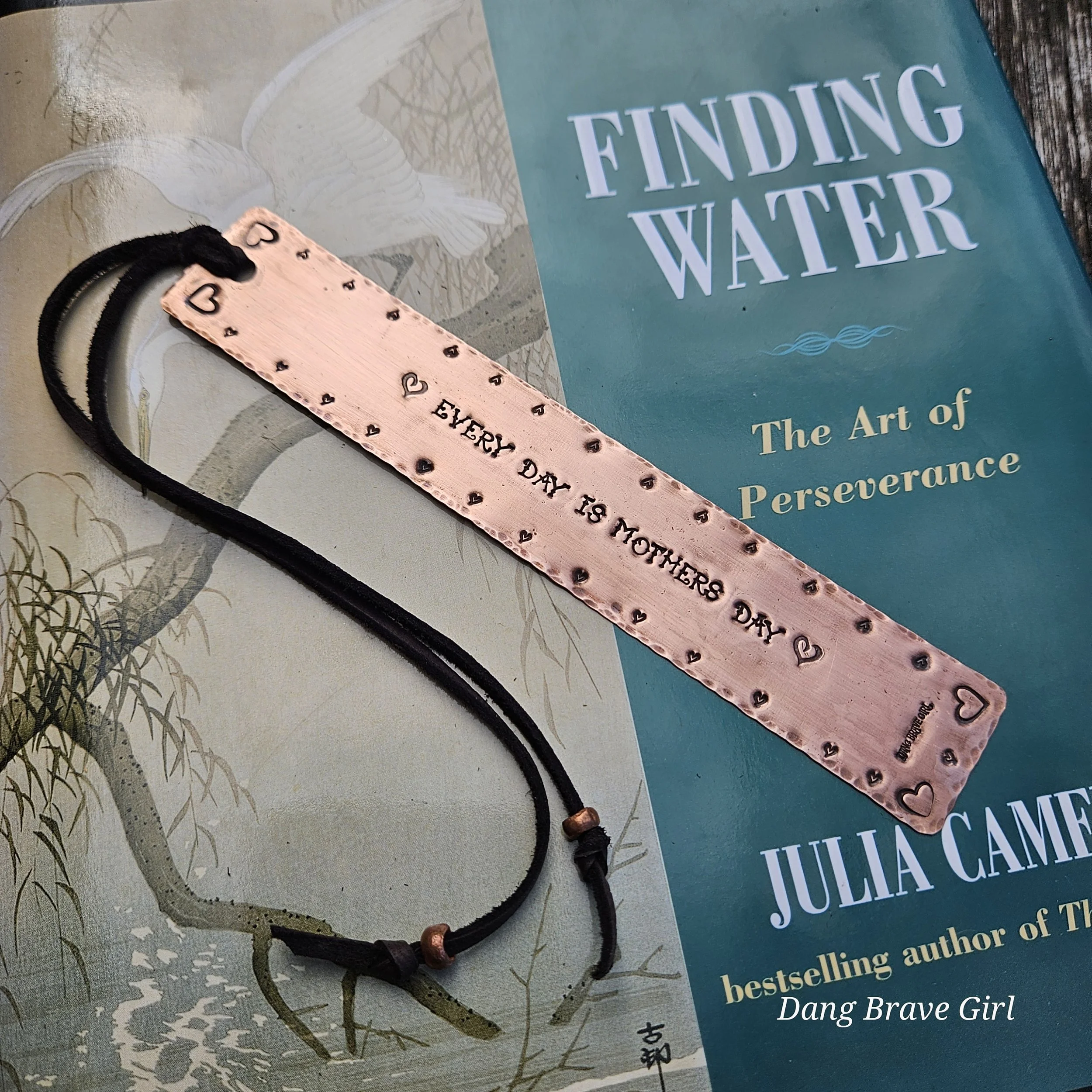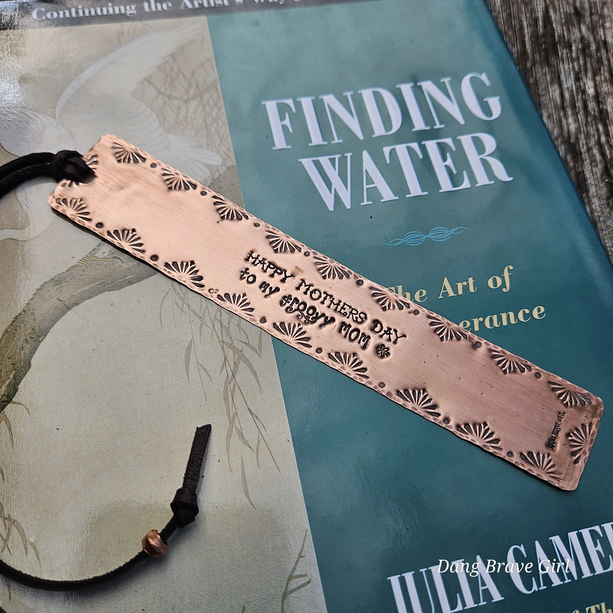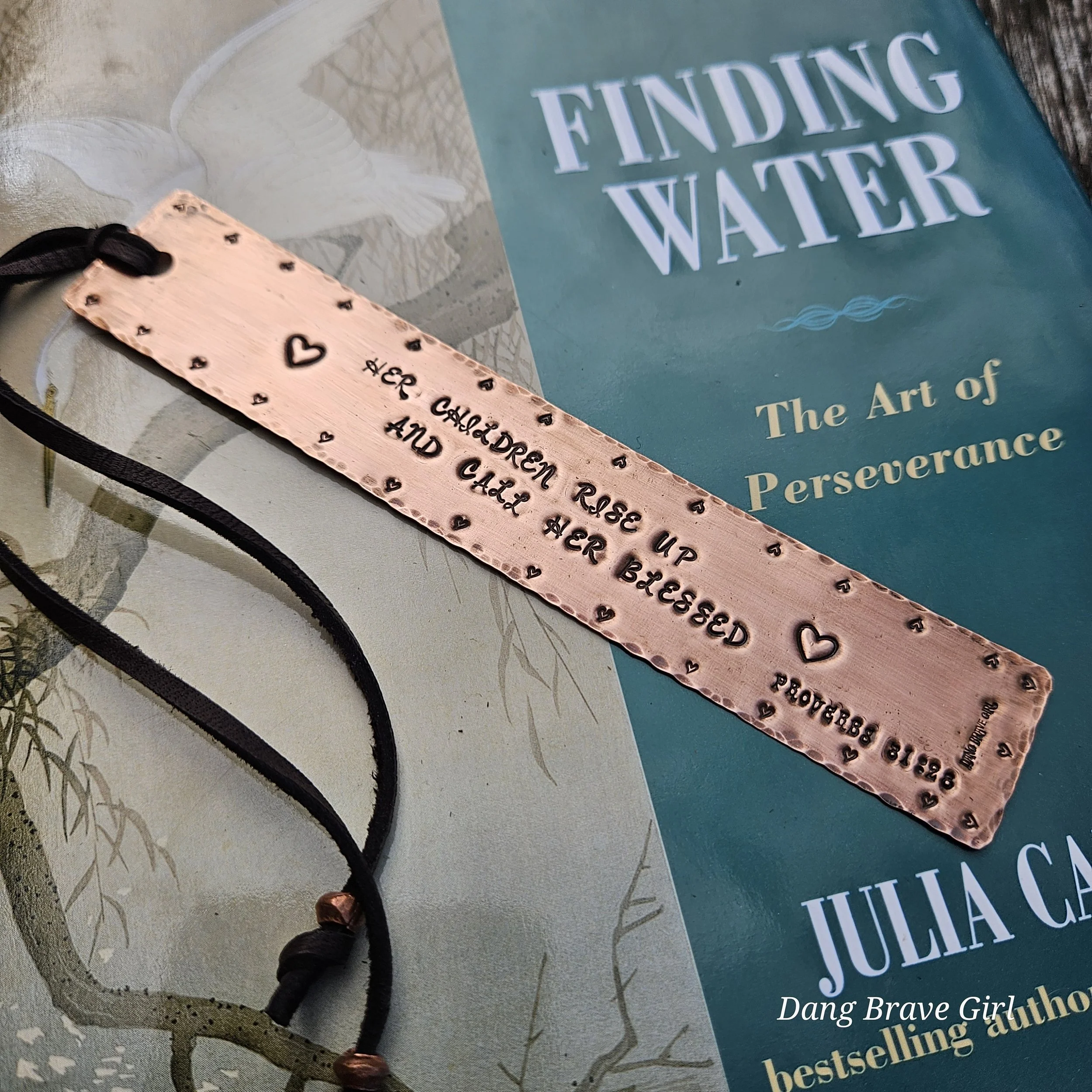 They measure 6” - 6 1/2” long and are 1” - 1 1/4” wide. Leather tassels are 4” - 6” long. The finished bookmarks were given a protective coating to help them from tarnishing but with time and regular use, they may take on the gorgeous patina copper is loved for.