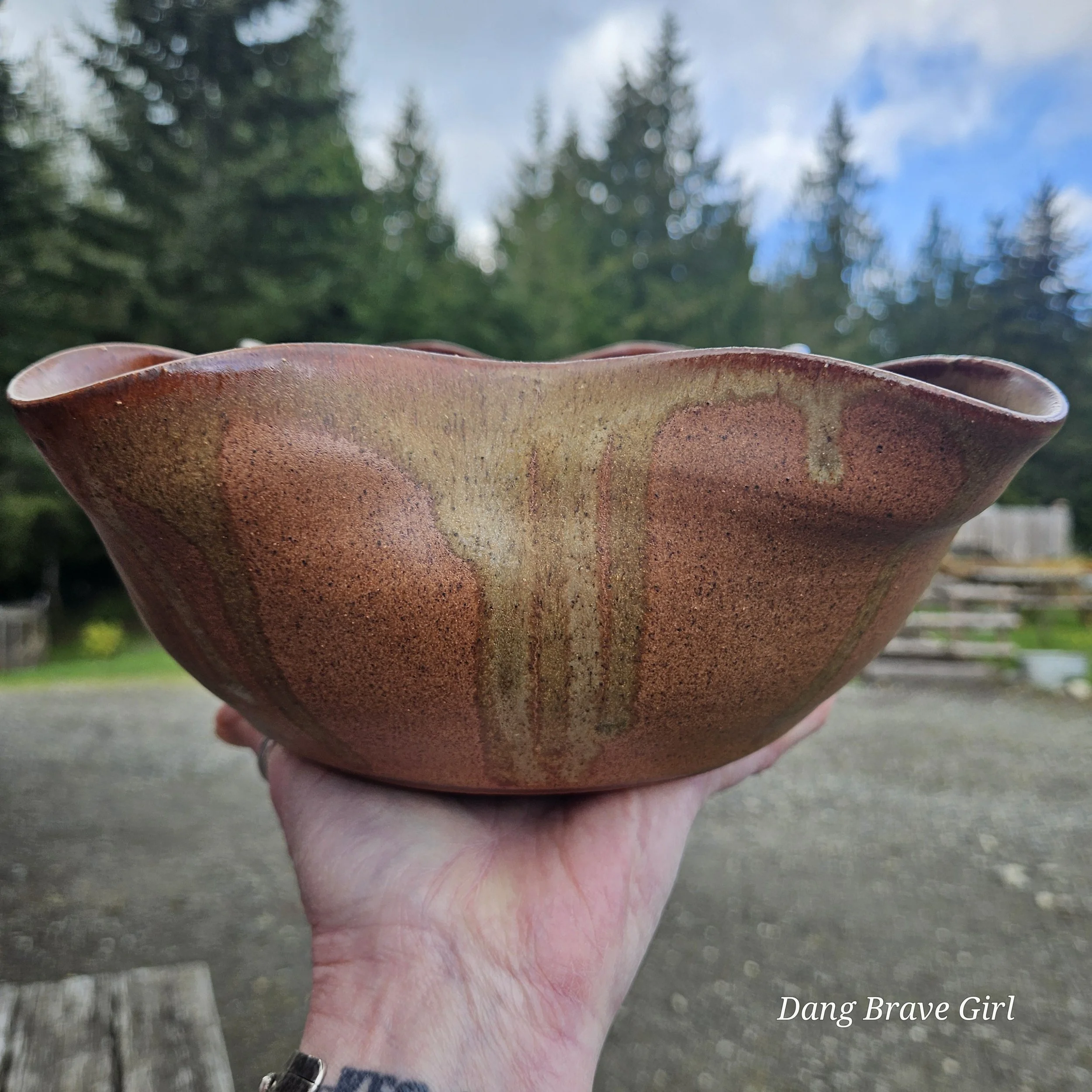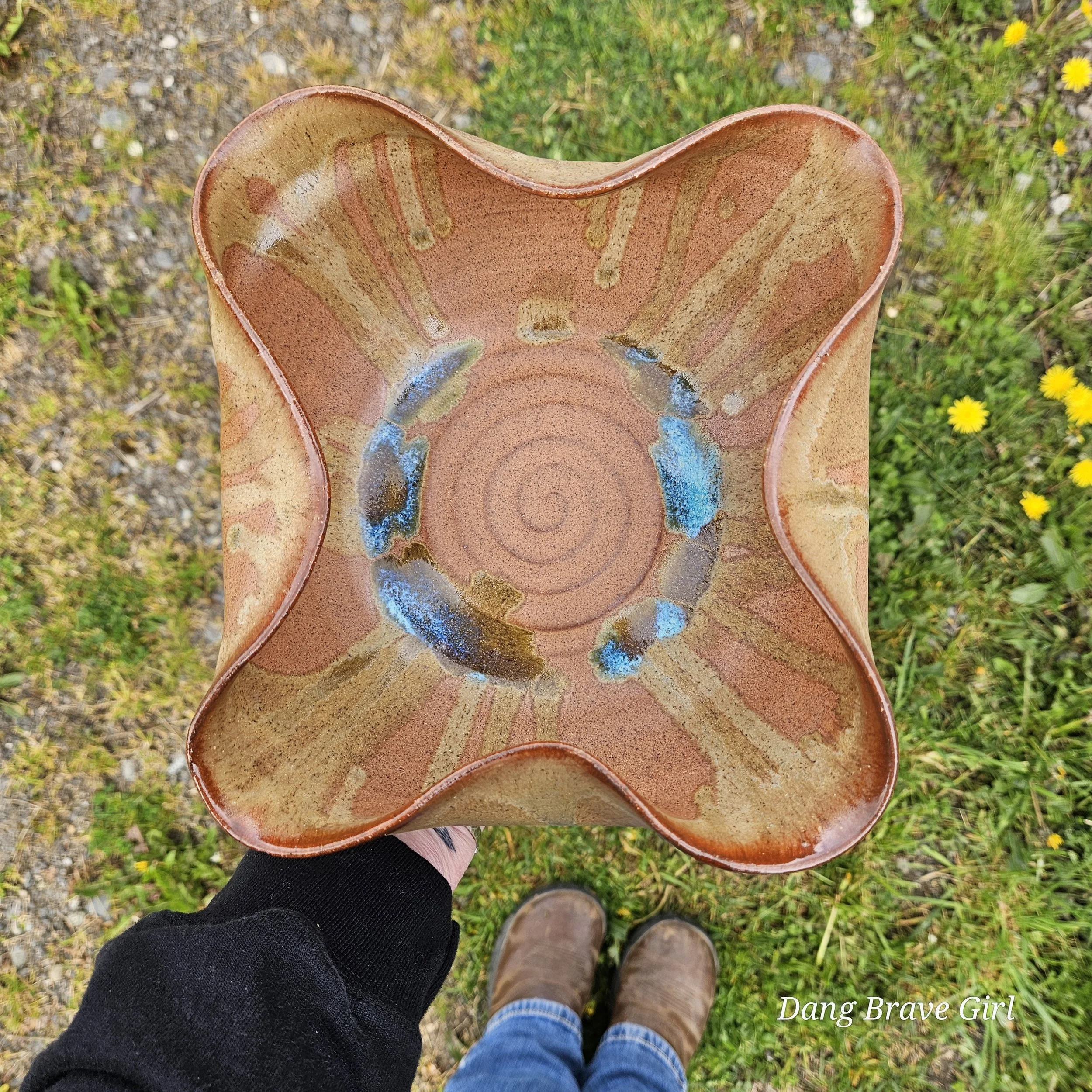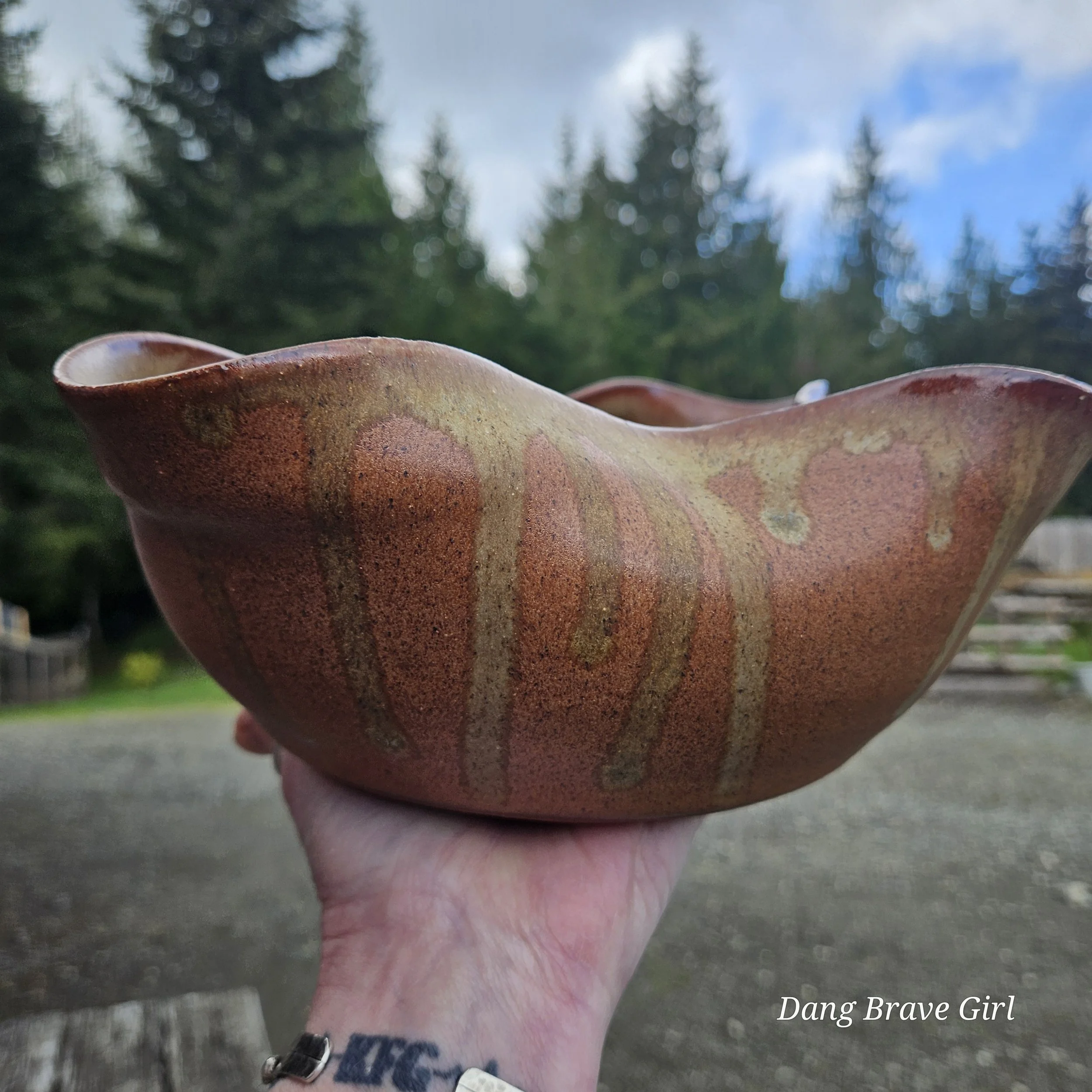 Handmade by the DBH with Oregon Red clay this a work of functional art. I can see this on your dining room or coffee table, maybe on a stack of big books…and of course, you could fill it with a bag of popcorn just to be fancy!