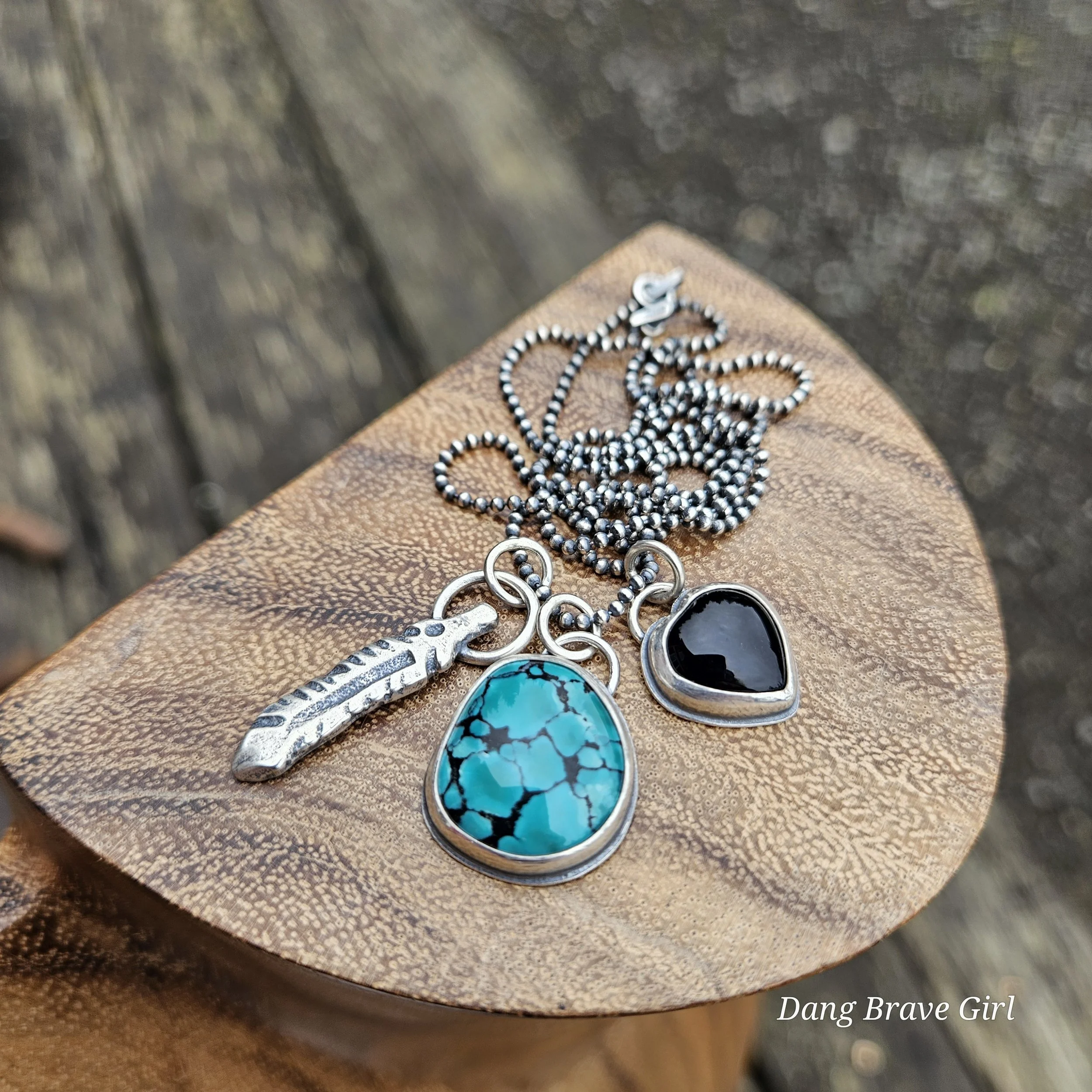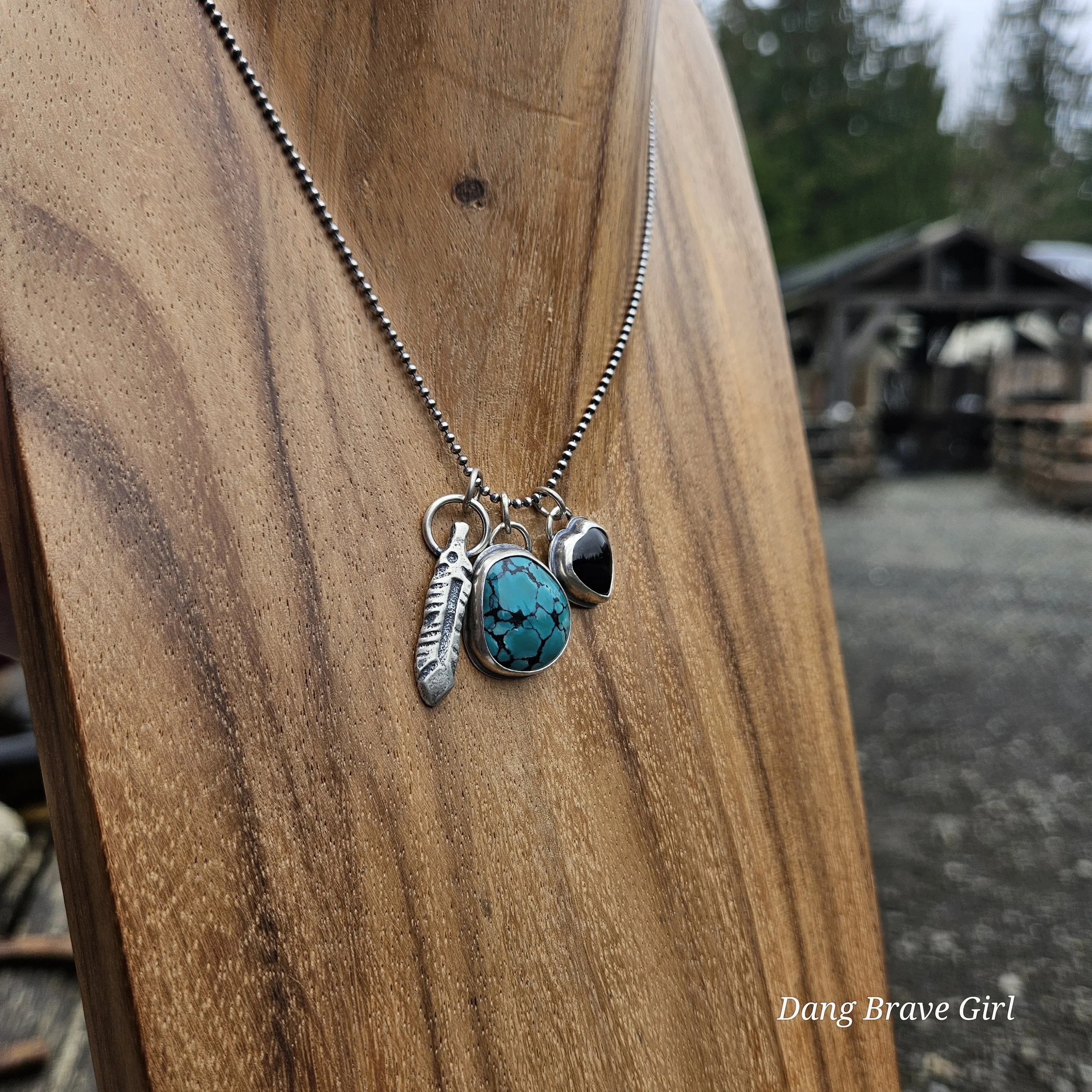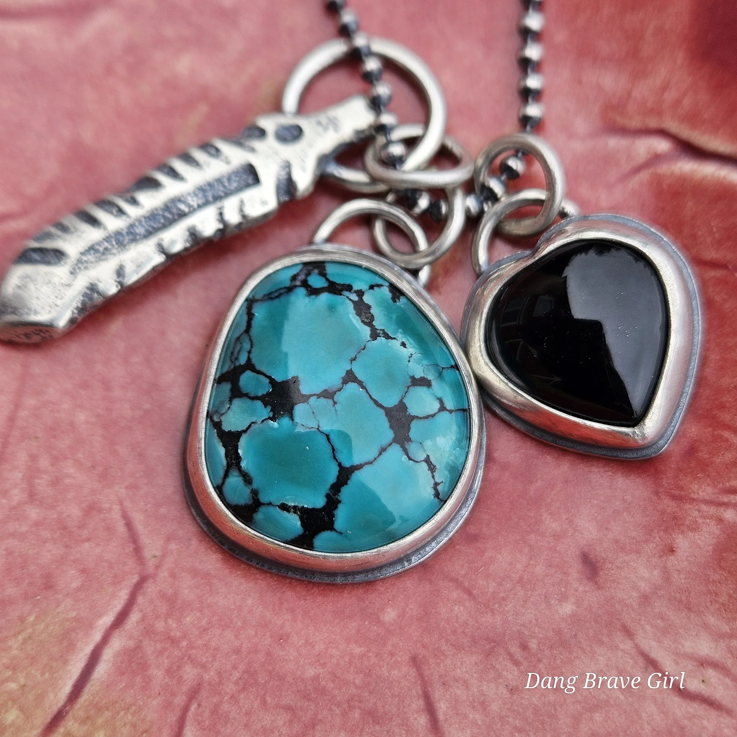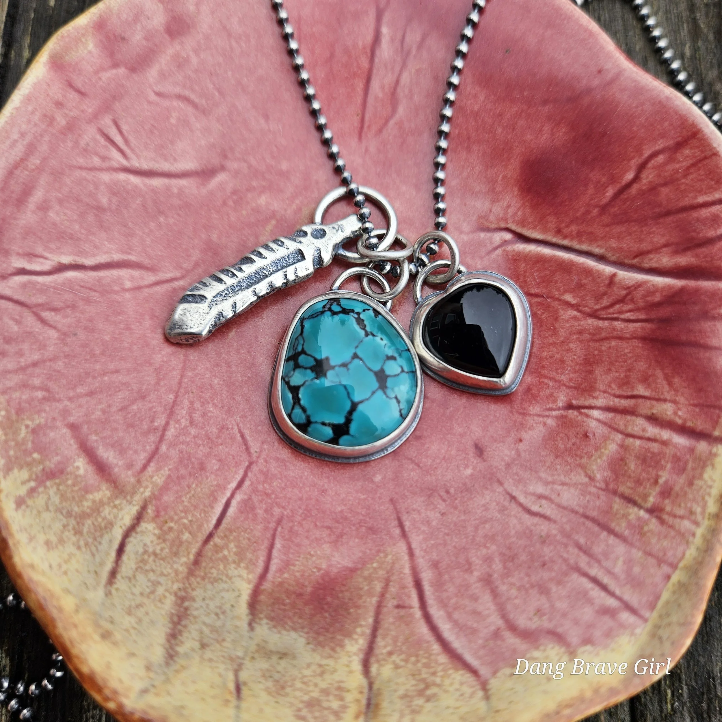 A handmade, solid sterling silver feather is keeping good company with a nice chunk of Hubei Turquoise and a Onyx heart. Both stone have homes in fine and sterling silver and all three charms hang on a 20” oxidized ball/bead chain made of sterling silver.