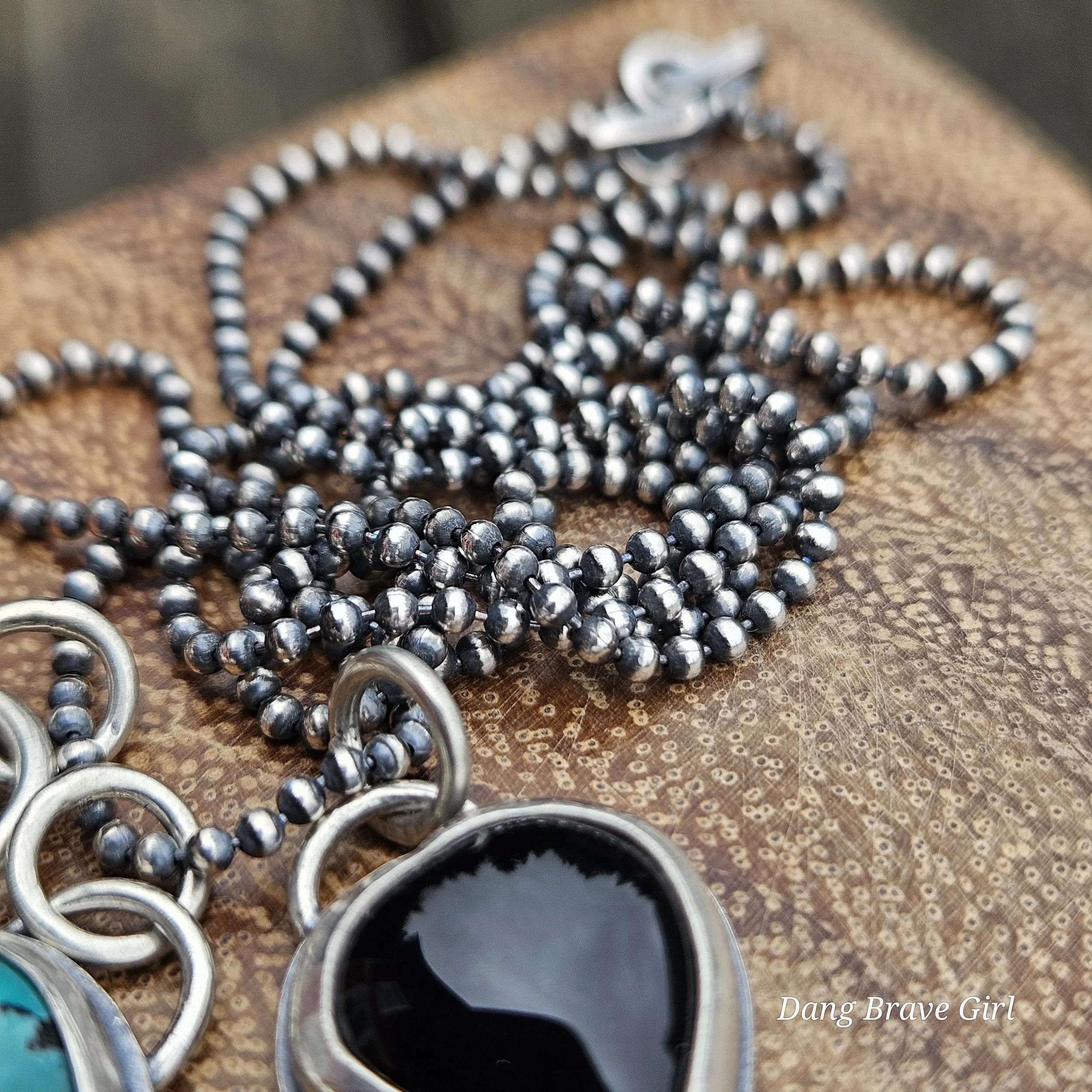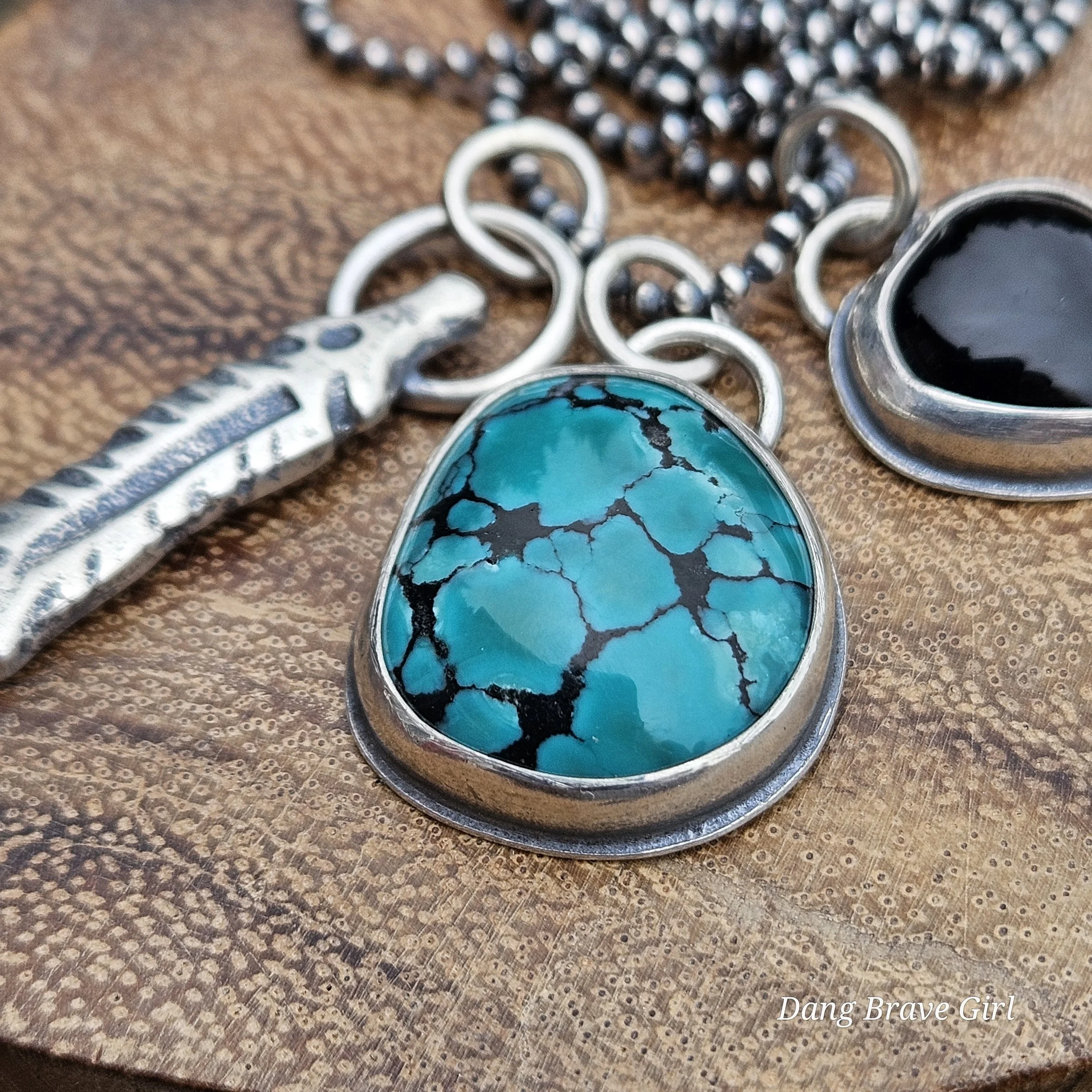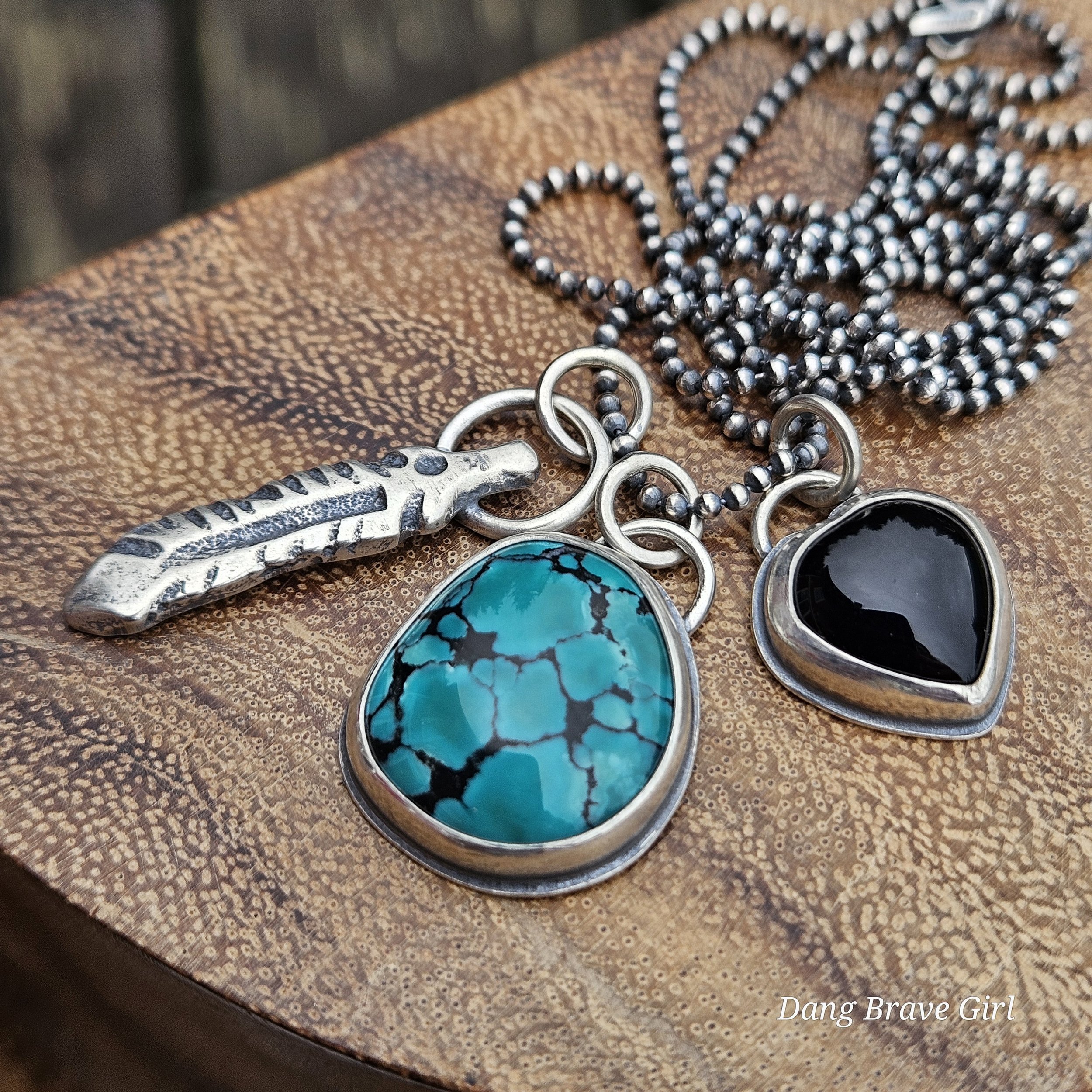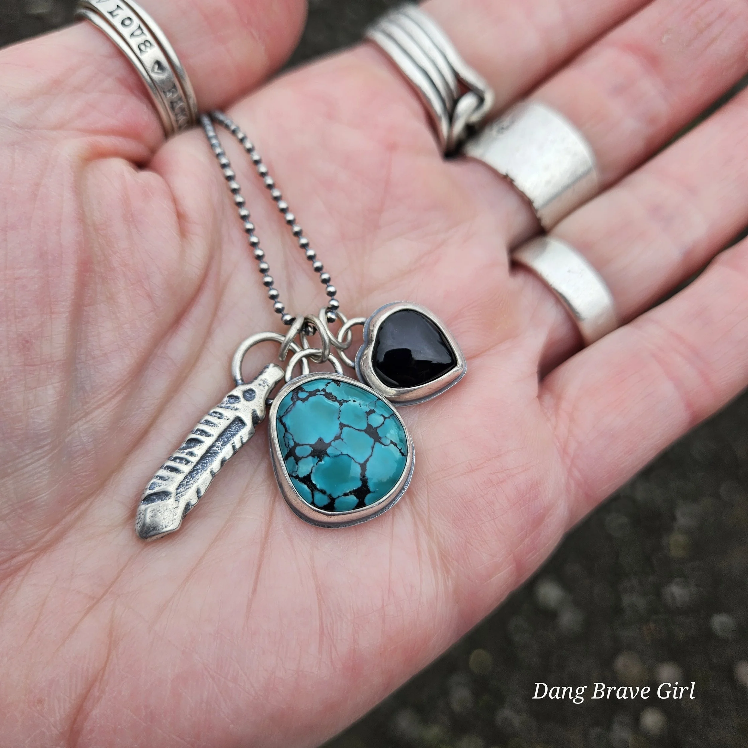 A handmade, solid sterling silver feather is keeping good company with a nice chunk of Hubei Turquoise and a Onyx heart. Both stone have homes in fine and sterling silver and all three charms hang on a 20” oxidized ball/bead chain made of sterling silver.
