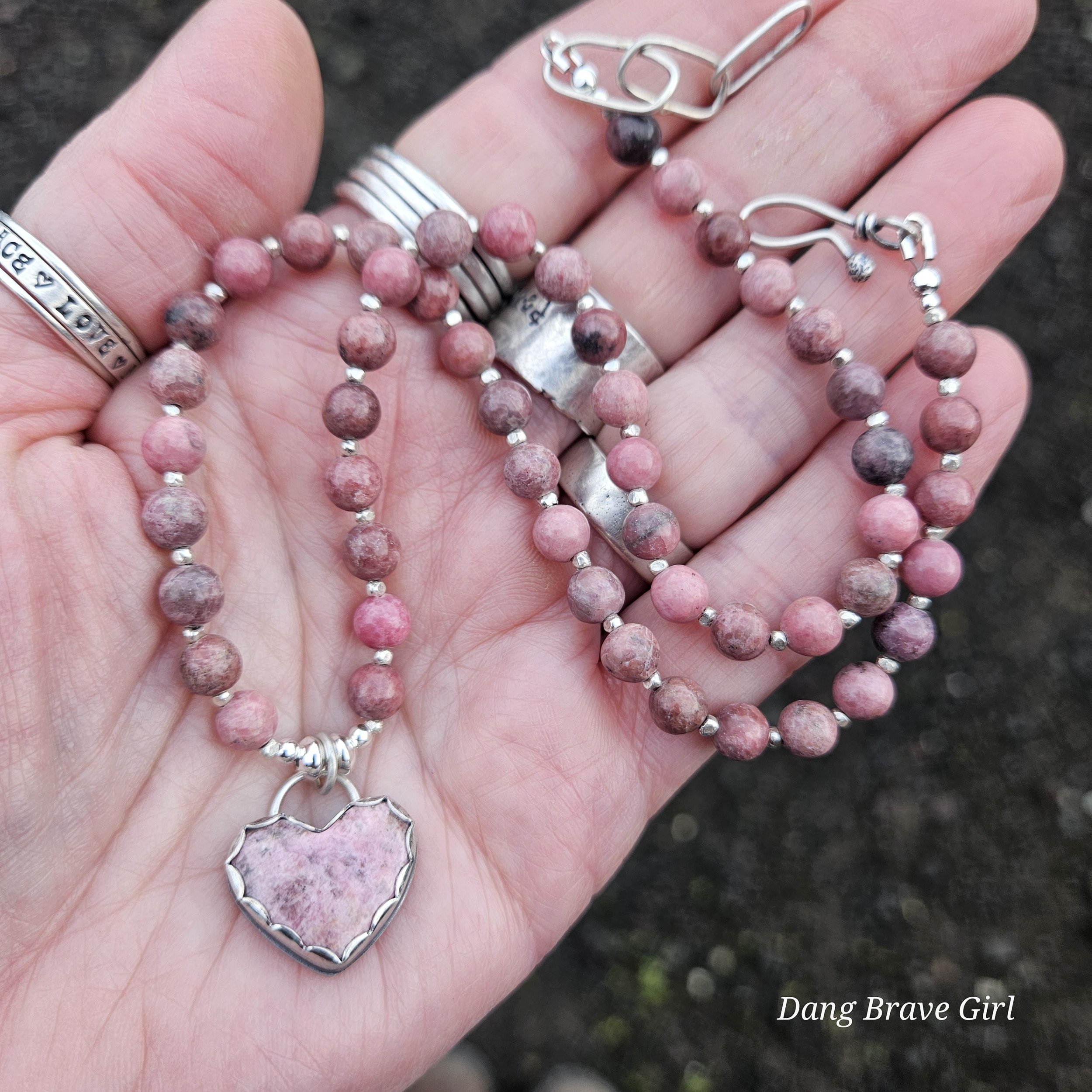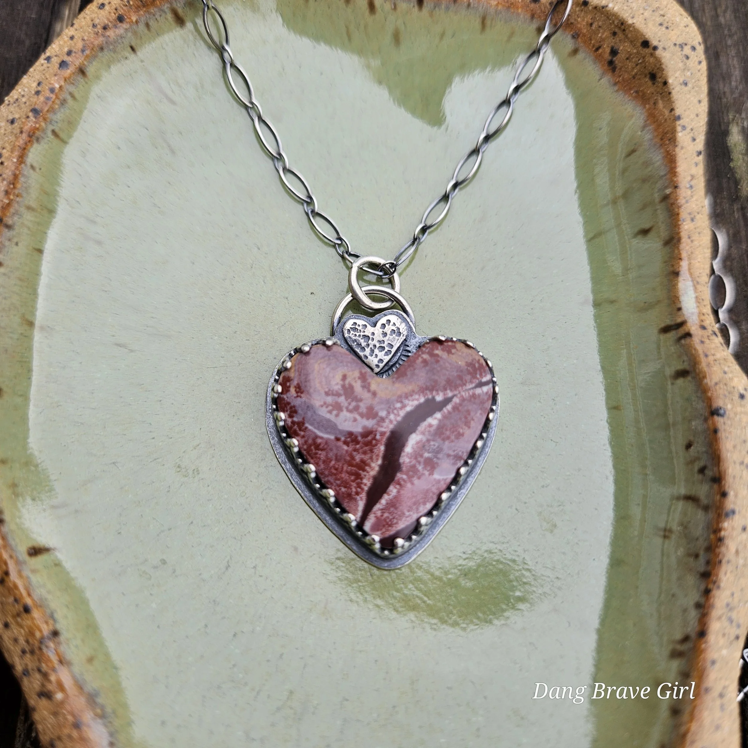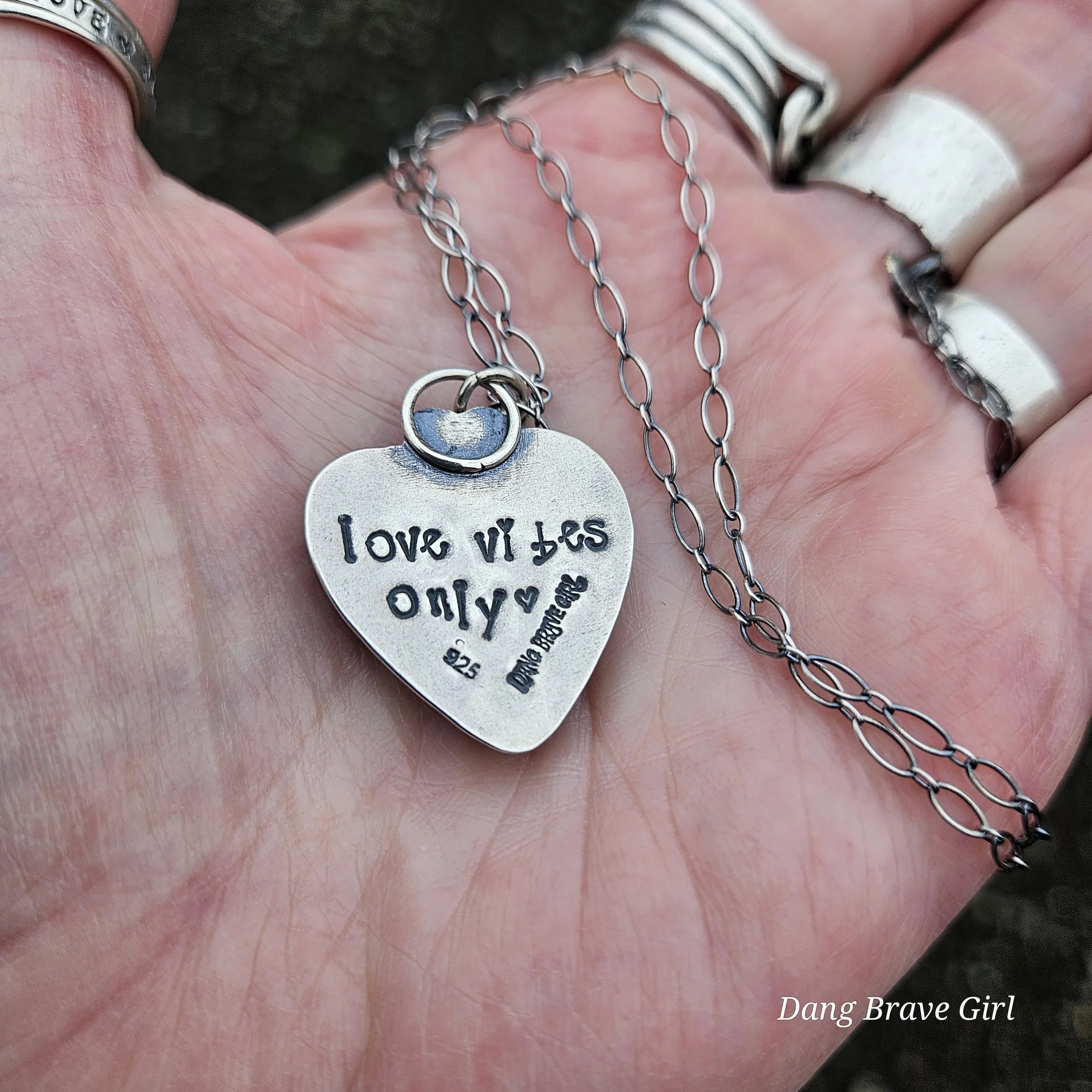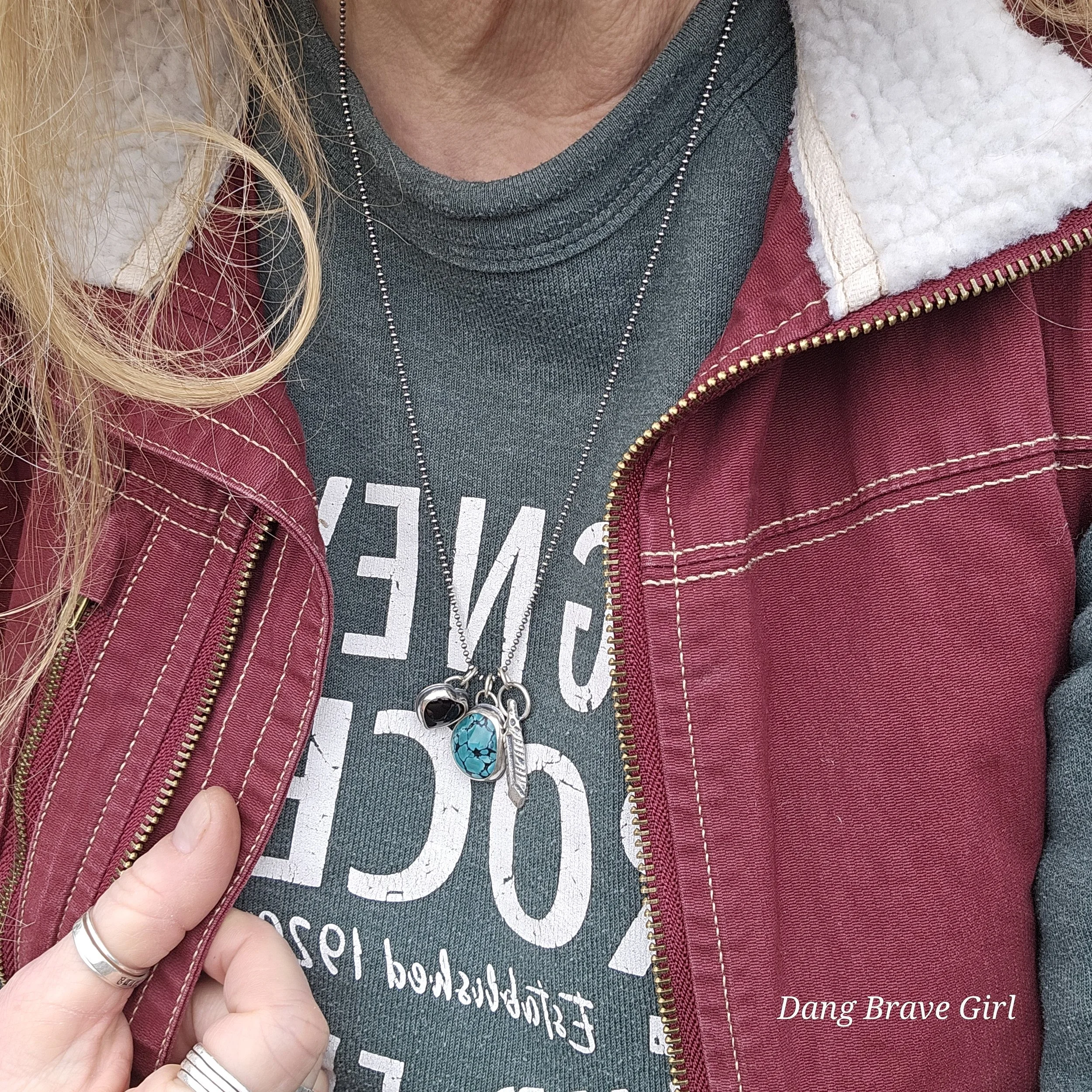 A handmade, solid sterling silver feather is keeping good company with a nice chunk of Hubei Turquoise and a Onyx heart. Both stone have homes in fine and sterling silver and all three charms hang on a 20” oxidized ball/bead chain made of sterling silver.