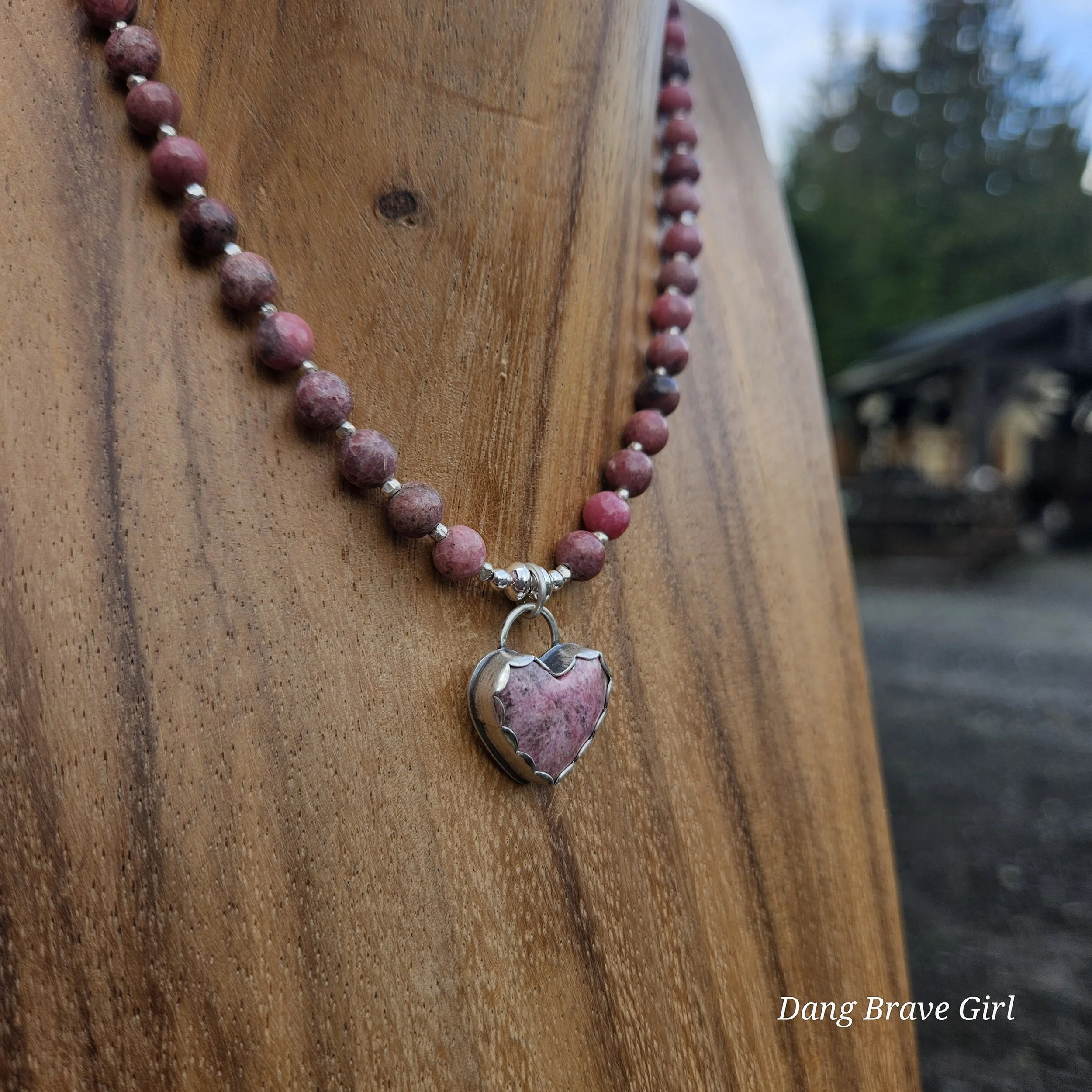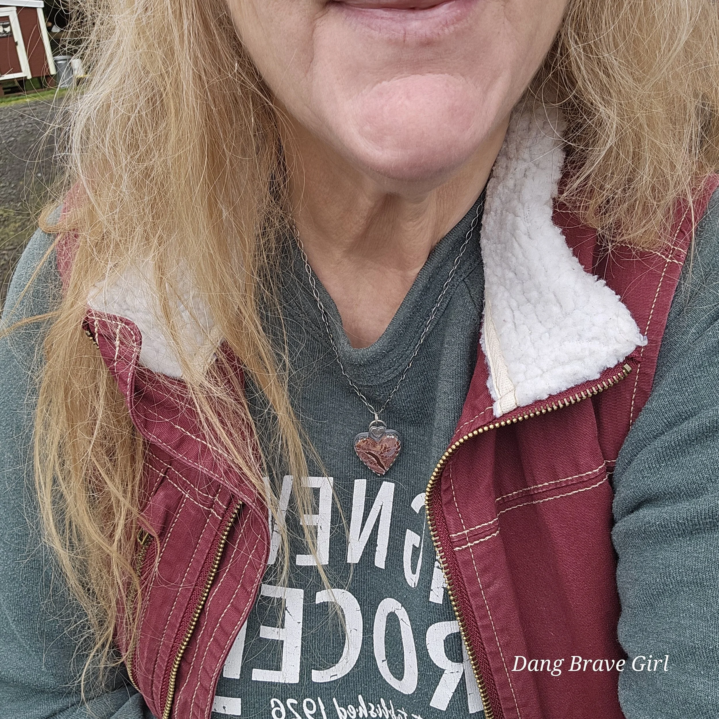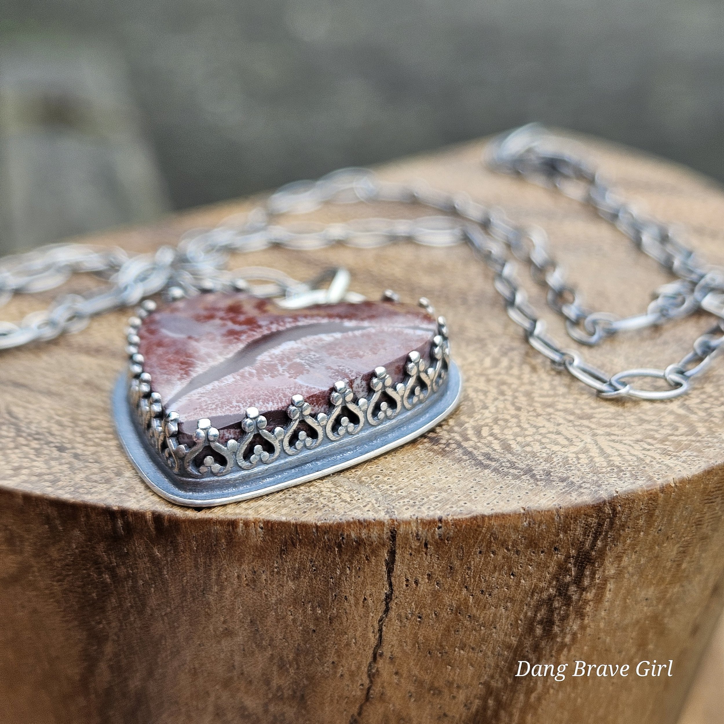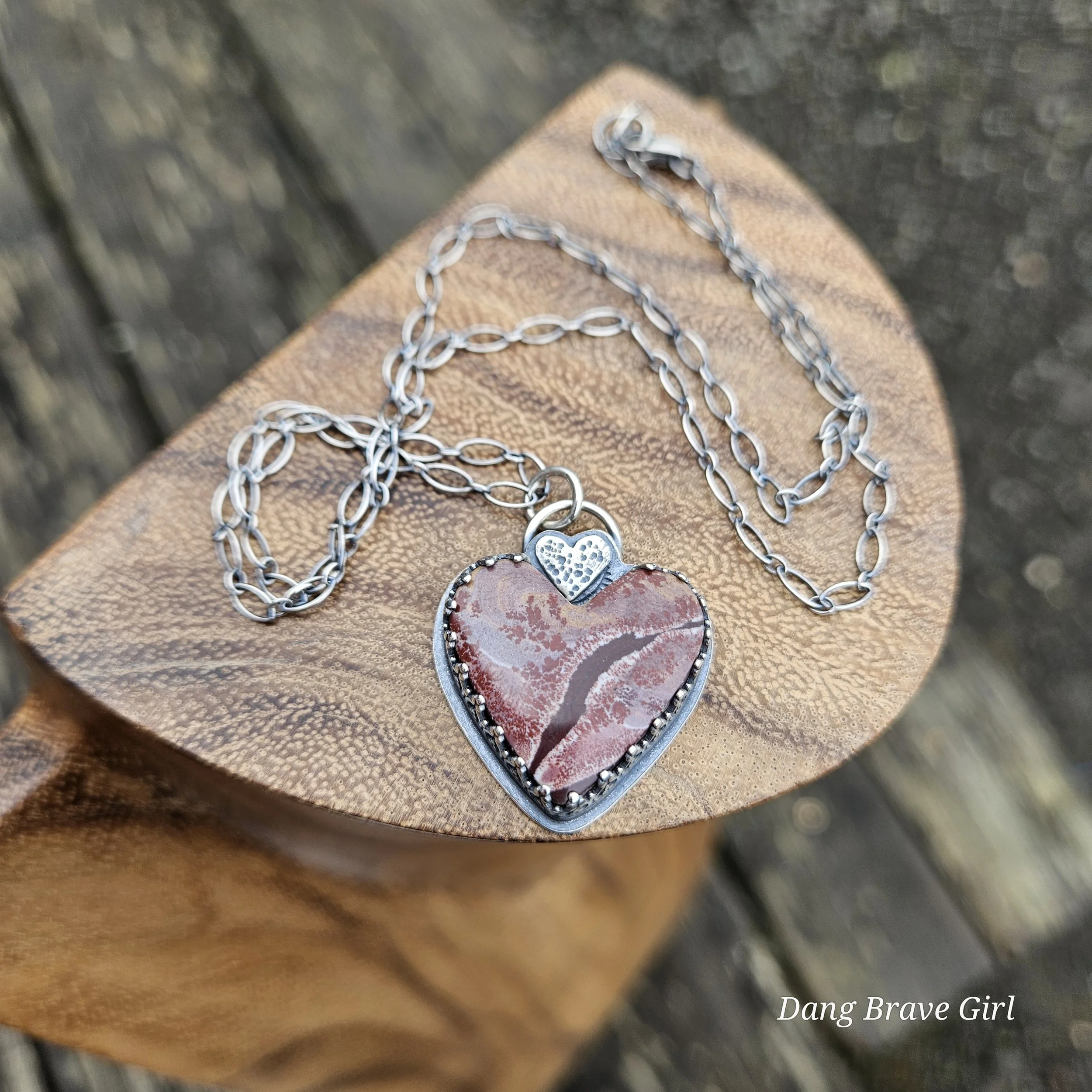 A handmade, solid sterling silver feather is keeping good company with a nice chunk of Hubei Turquoise and a Onyx heart. Both stone have homes in fine and sterling silver and all three charms hang on a 20” oxidized ball/bead chain made of sterling silver.