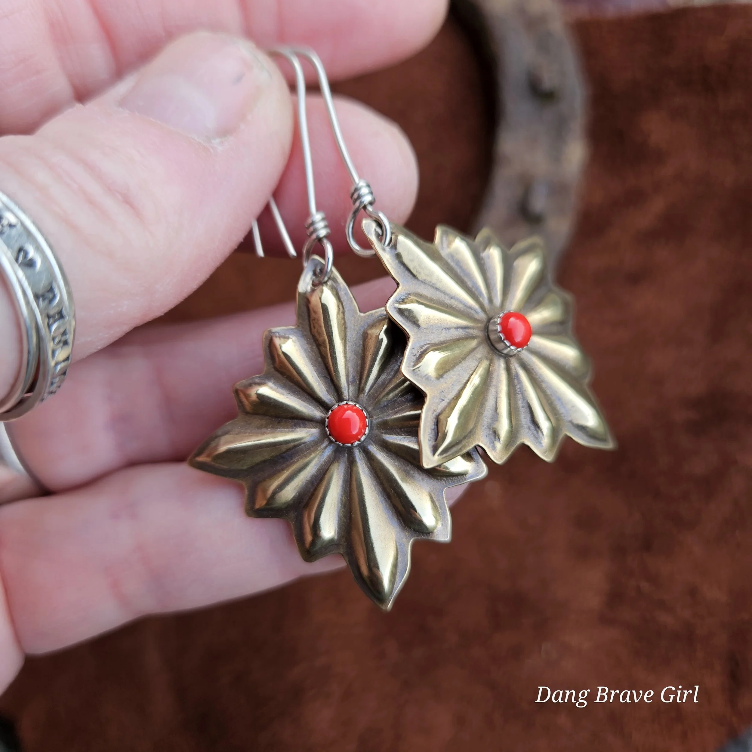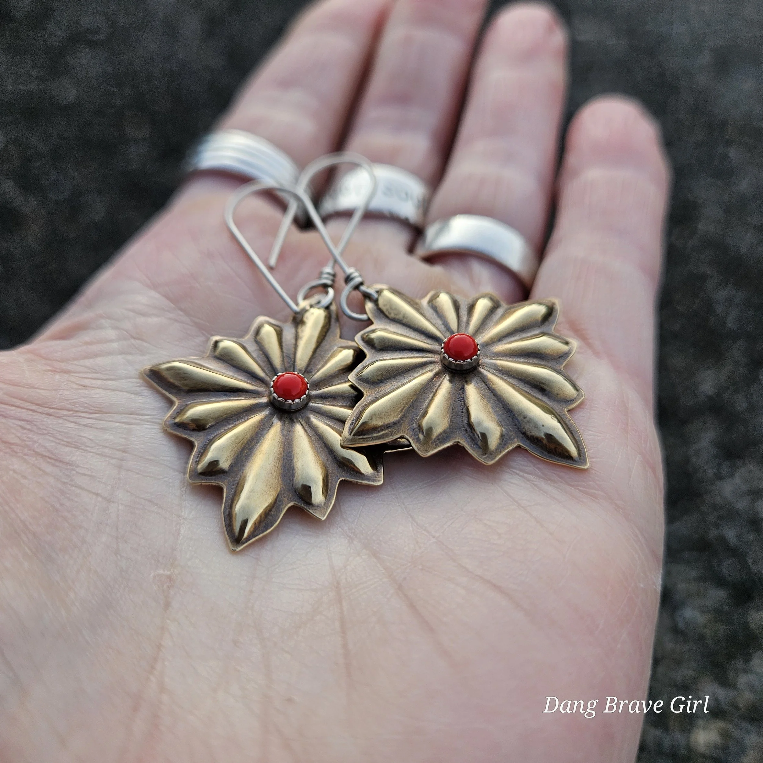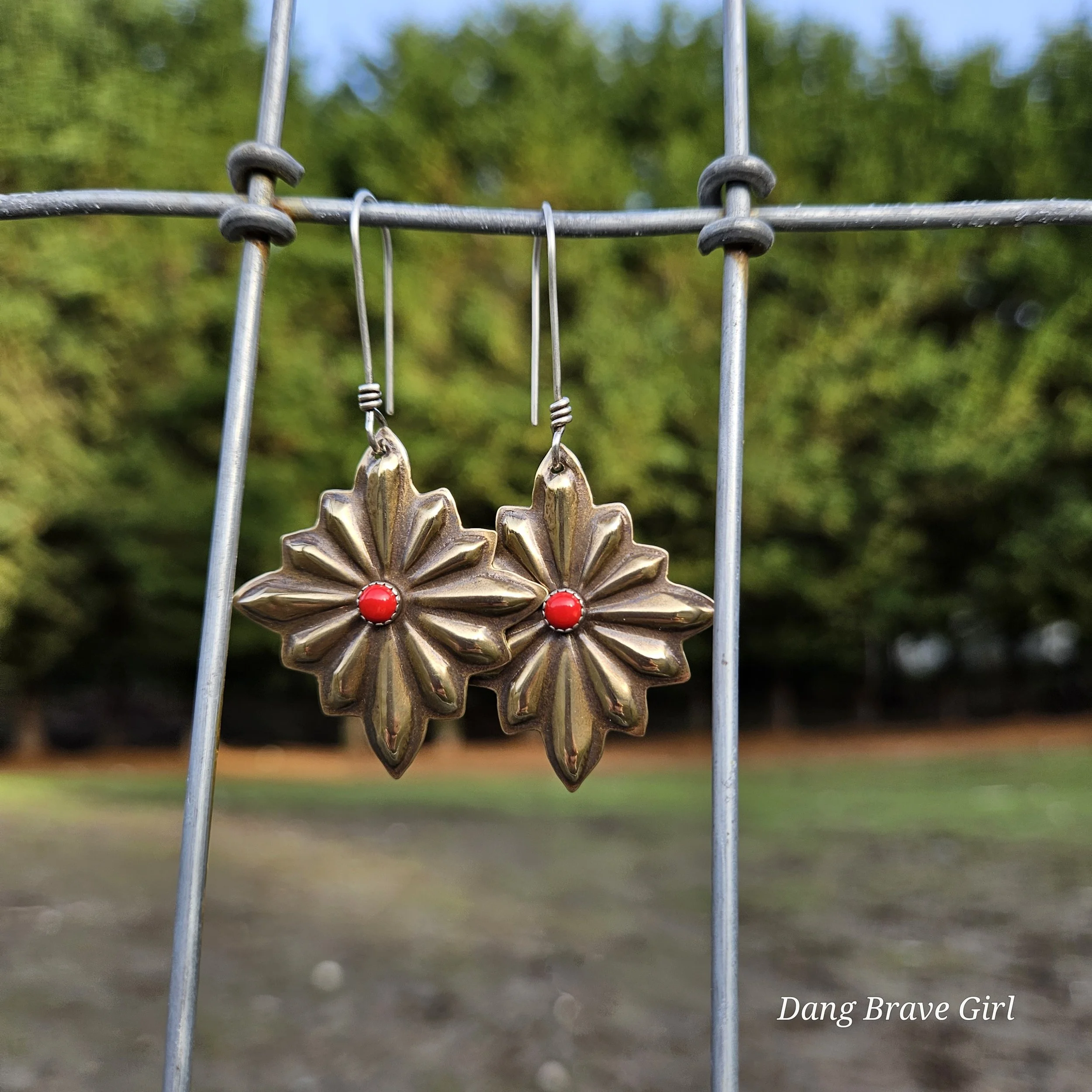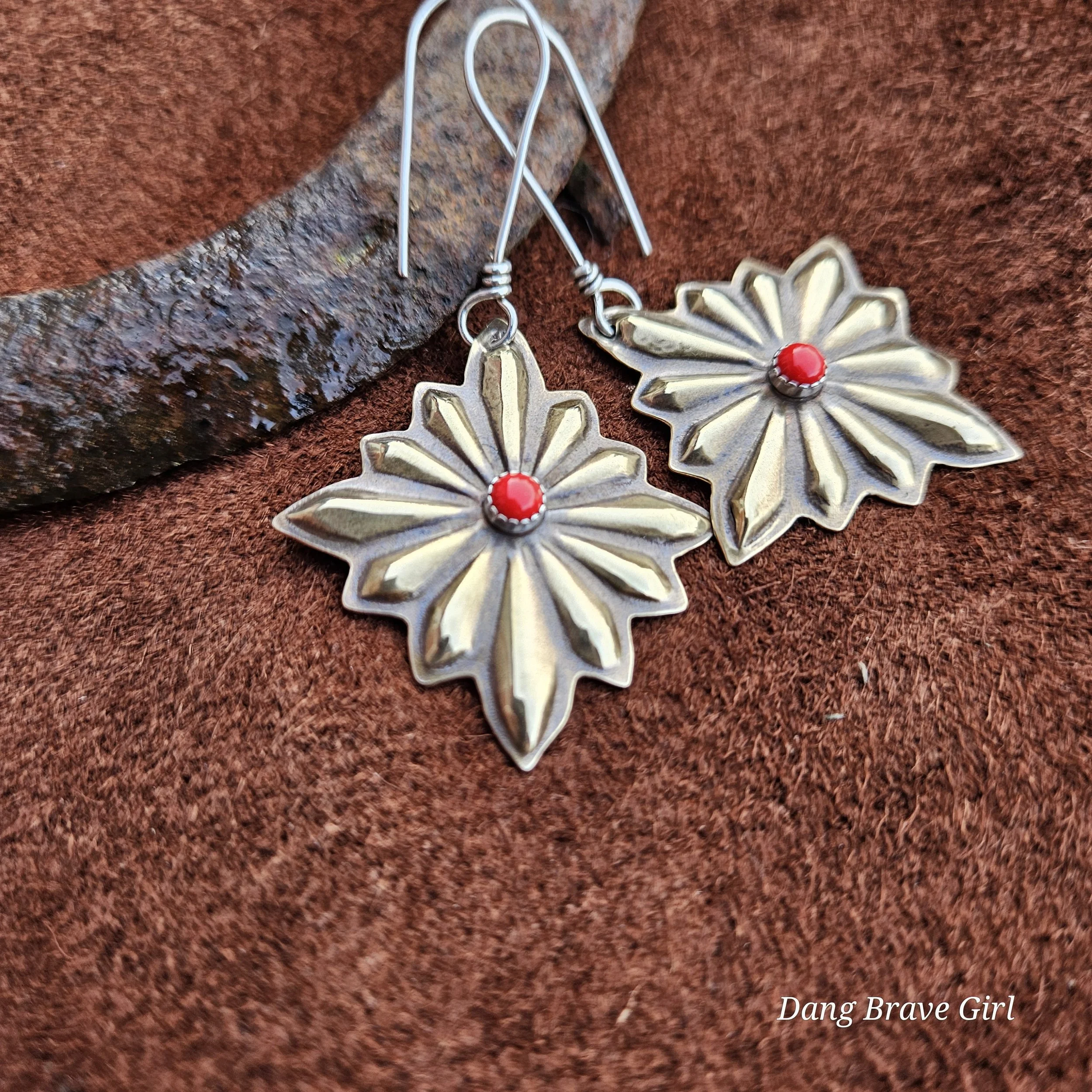 These concho style earrings have great depth and dimension, while remaining lightweight. The coral has a home in sterling silver and they are finished with a rich patina and soft polish to highlight the details.