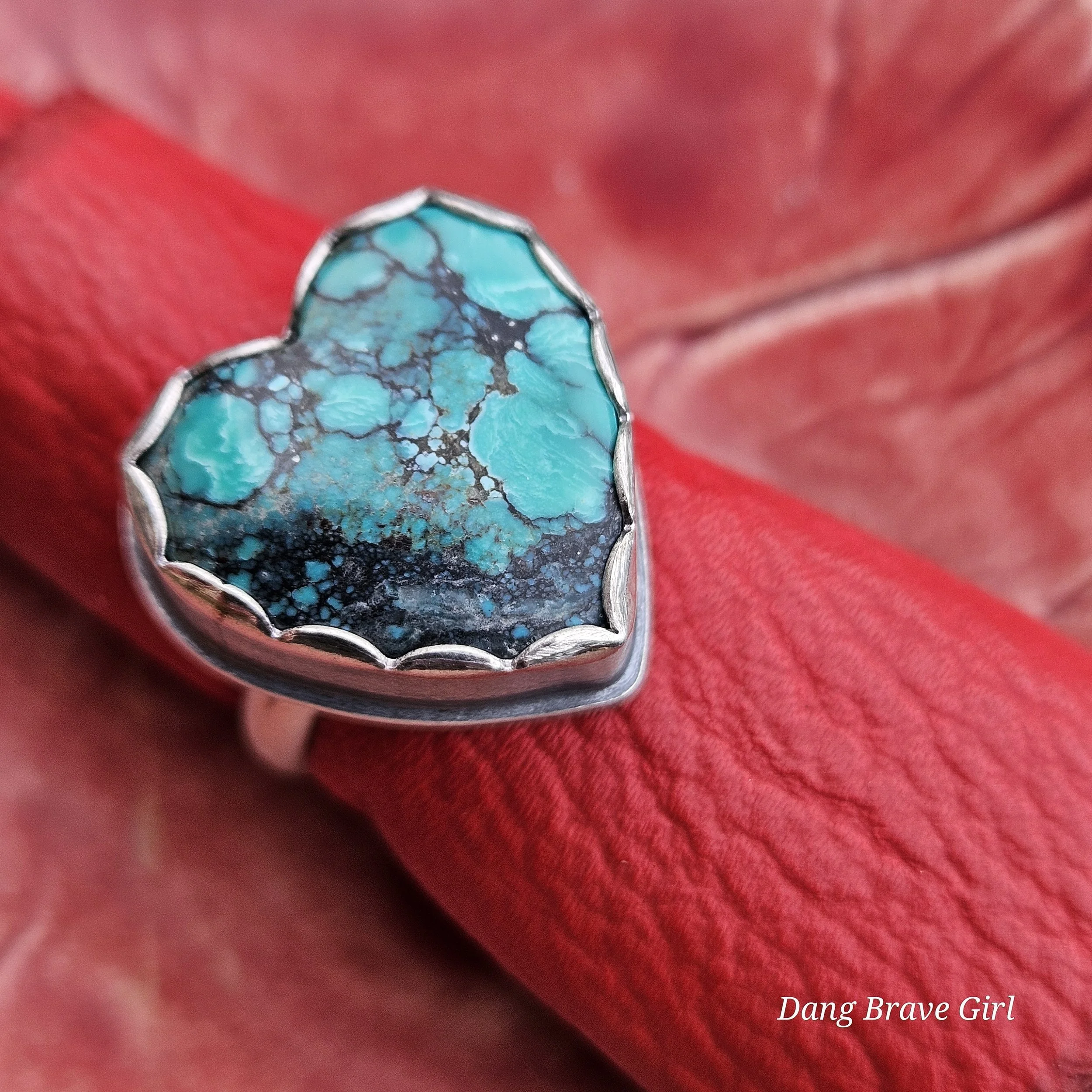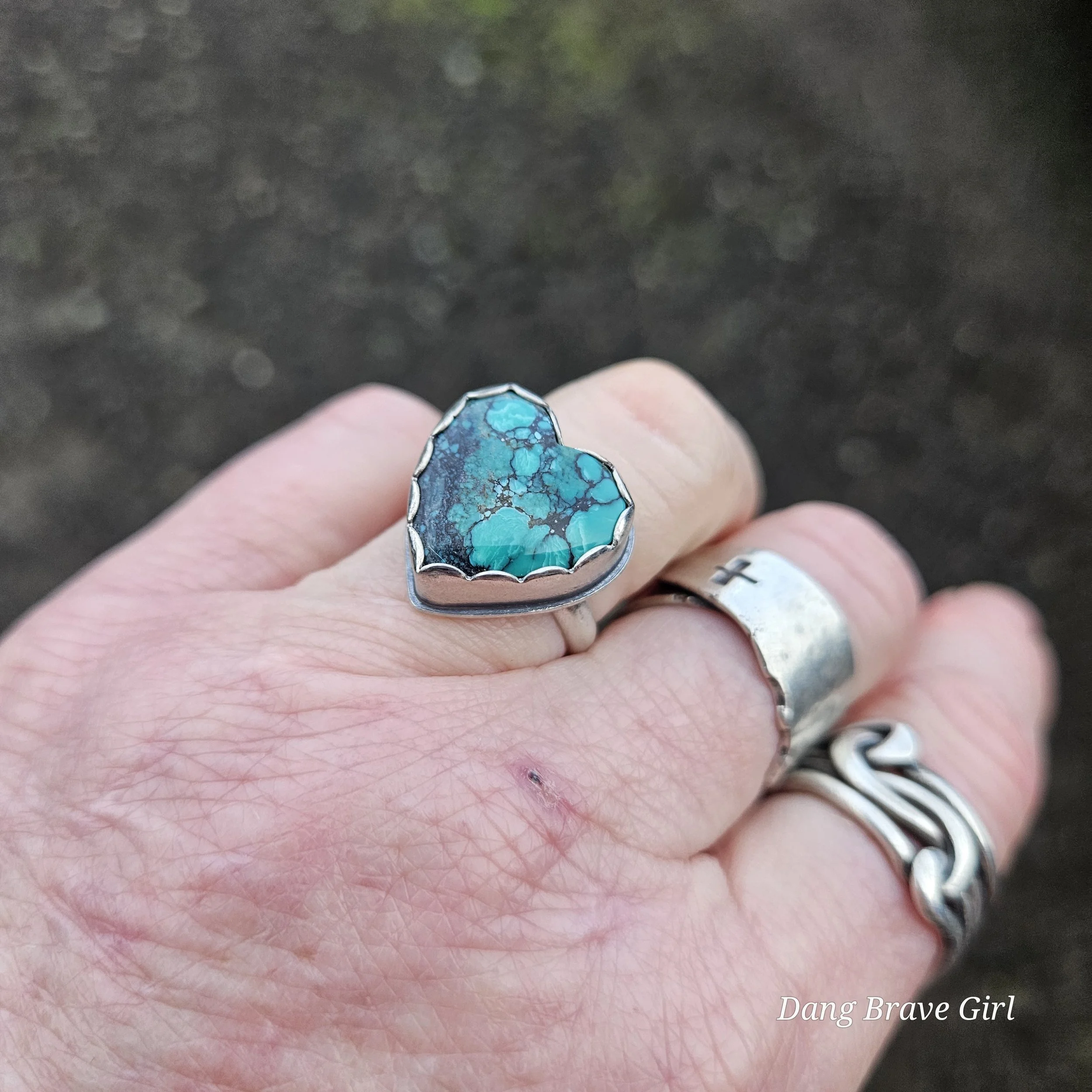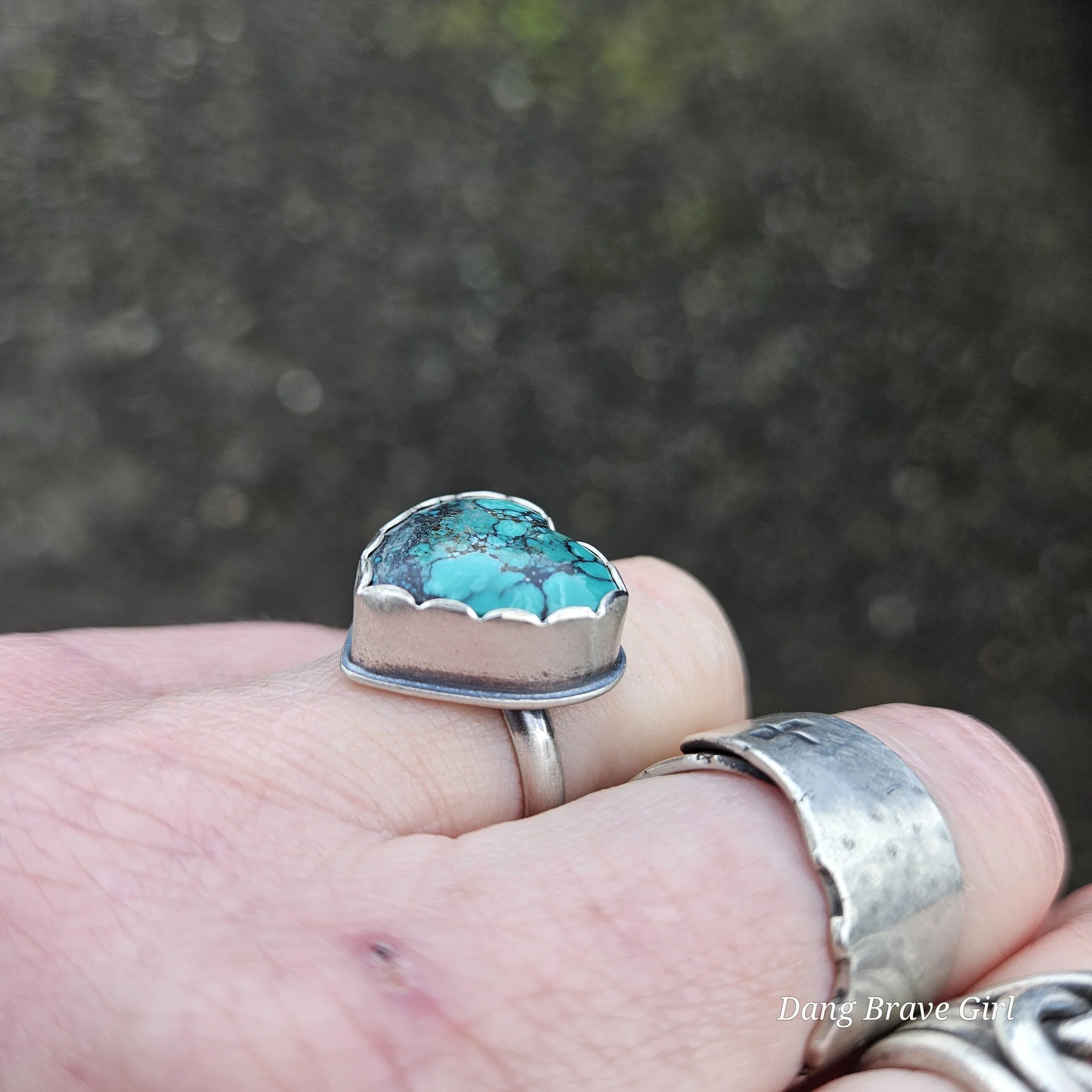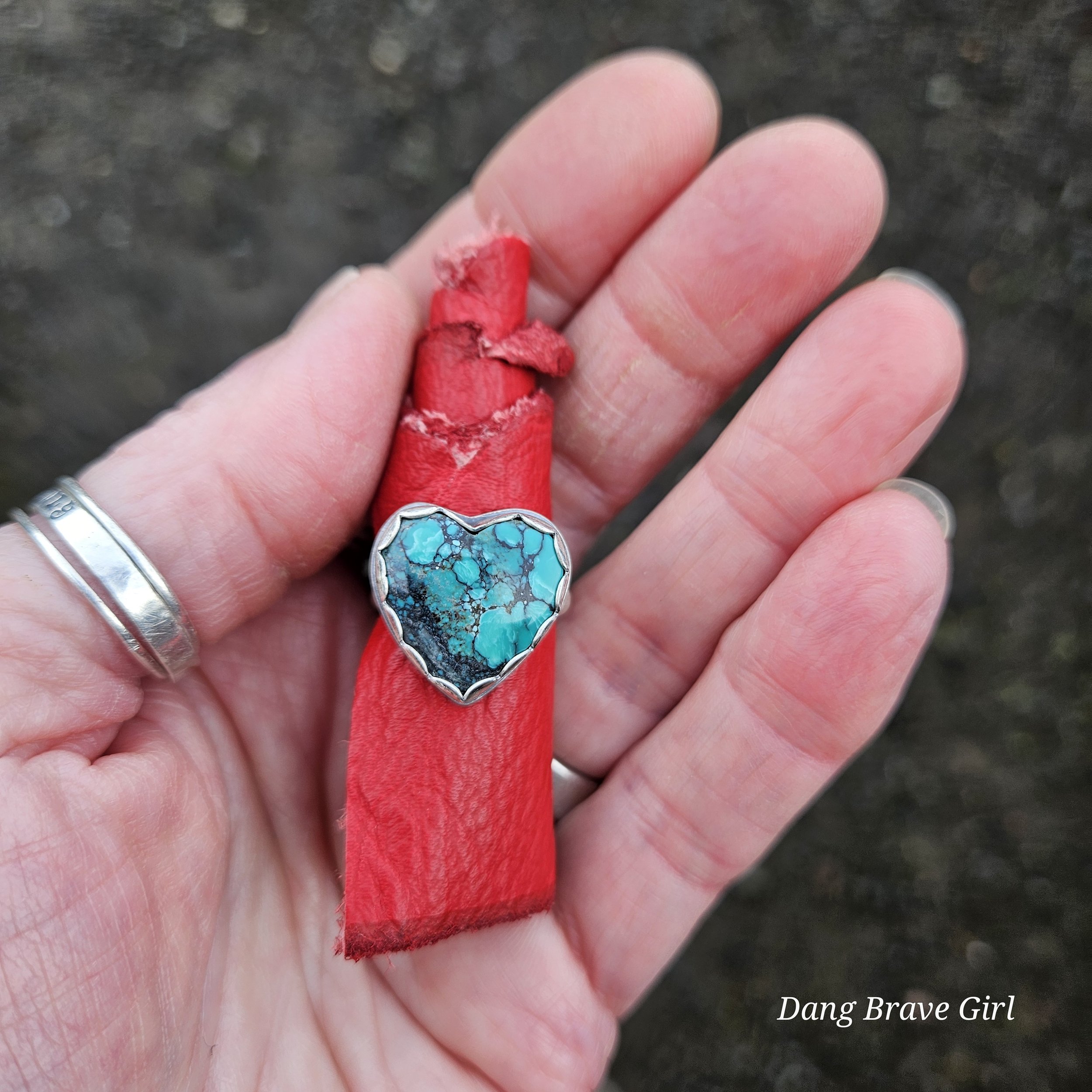 This chunky Hubei Turquoise heart has a home in fine and sterling silver, with a comfortable band, made in a size 6.5.