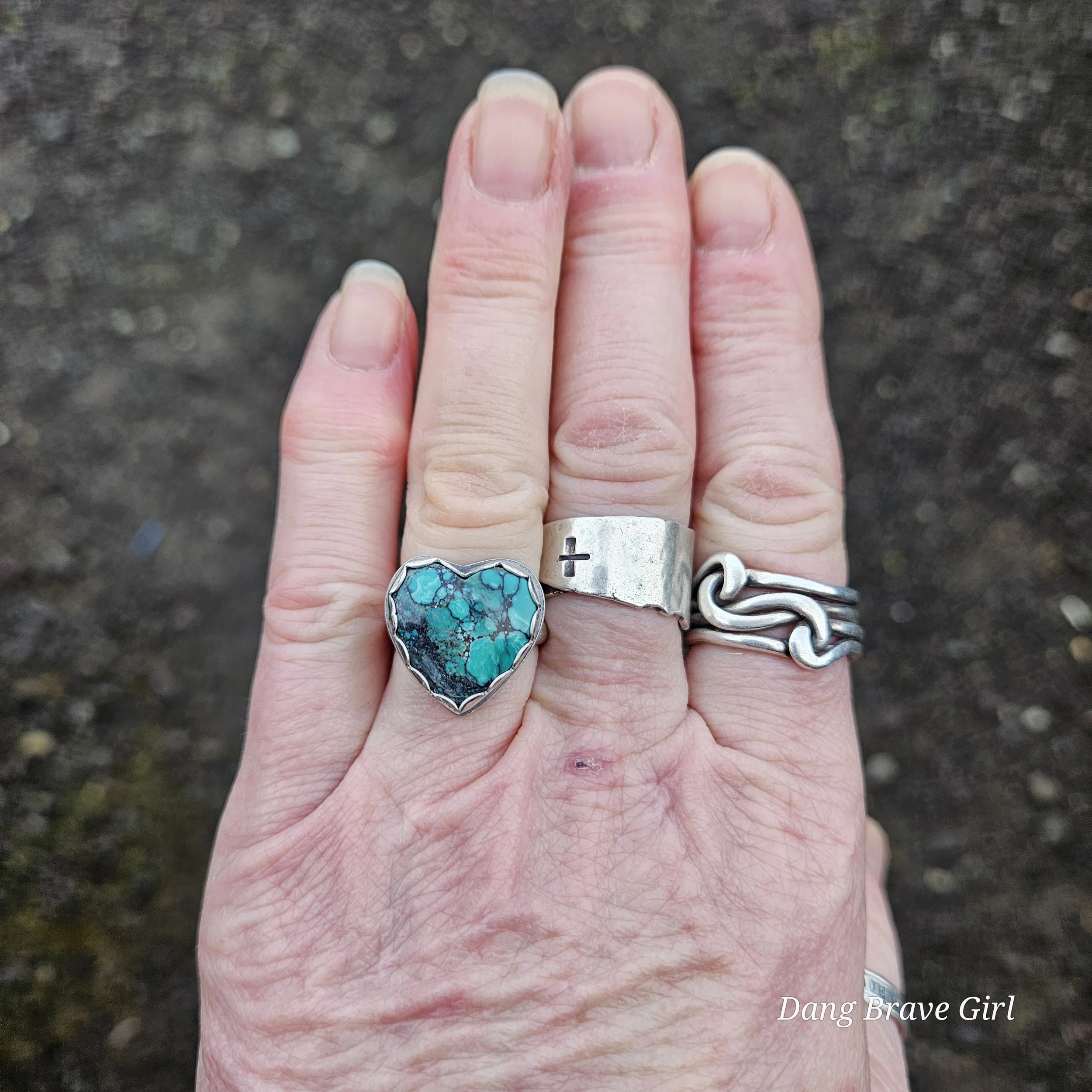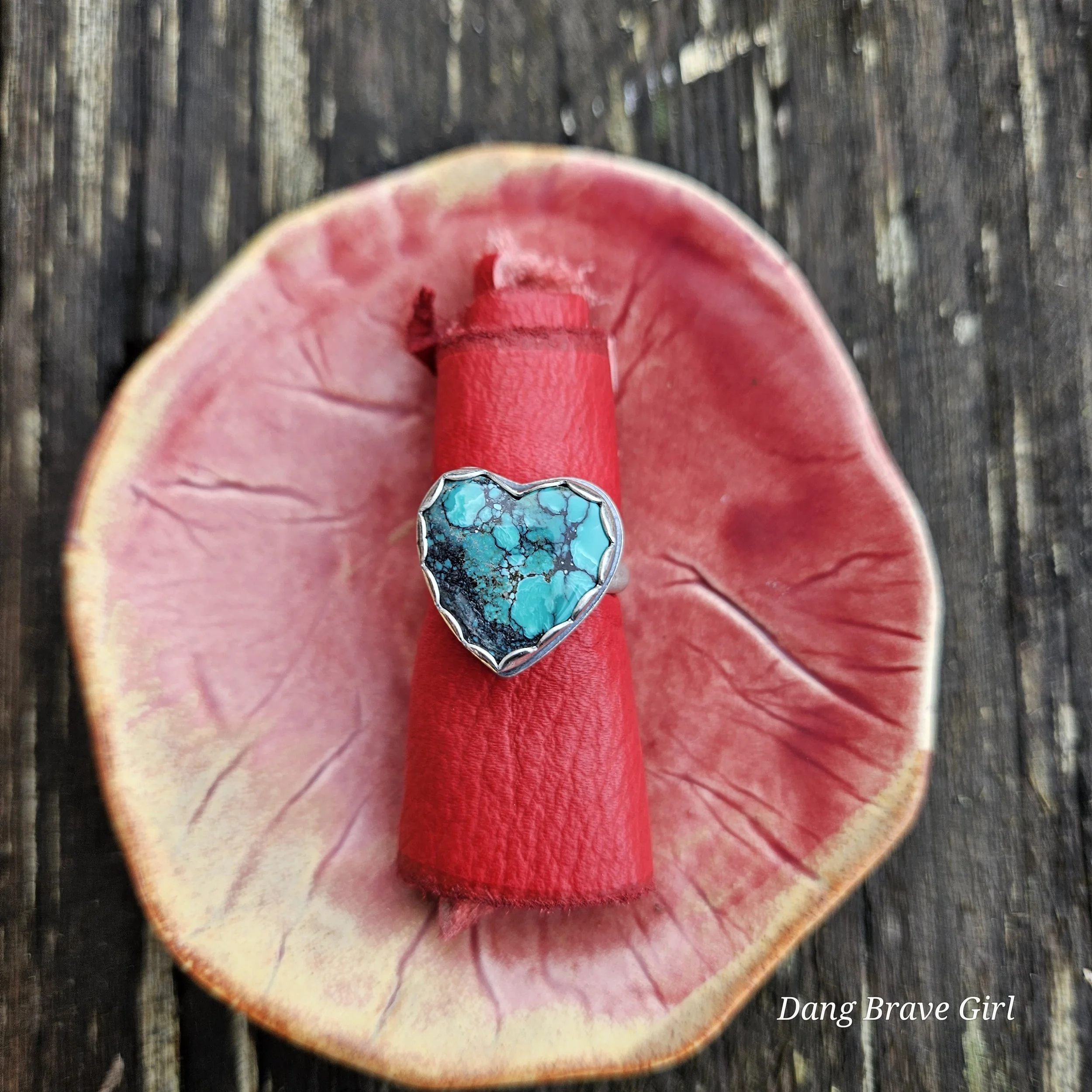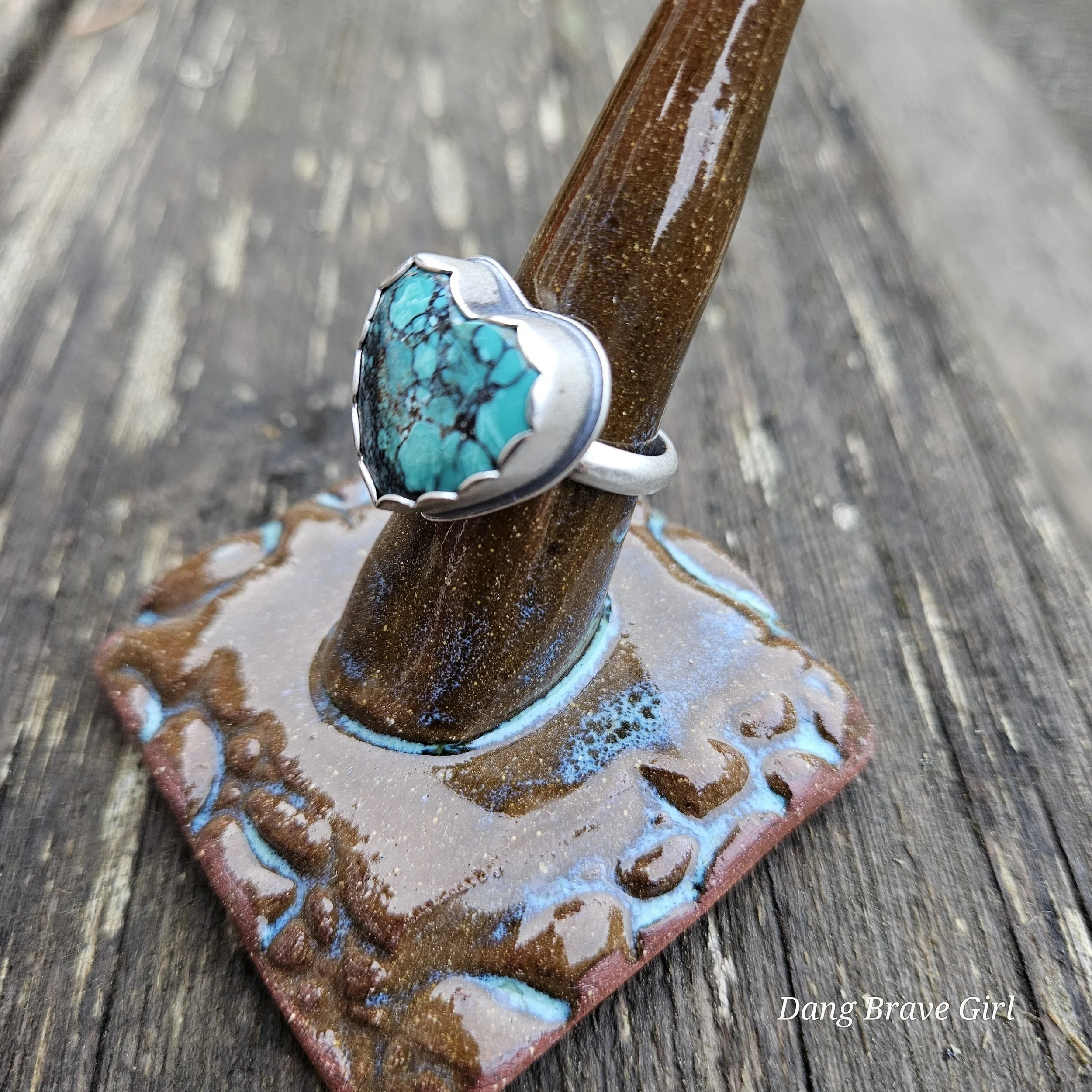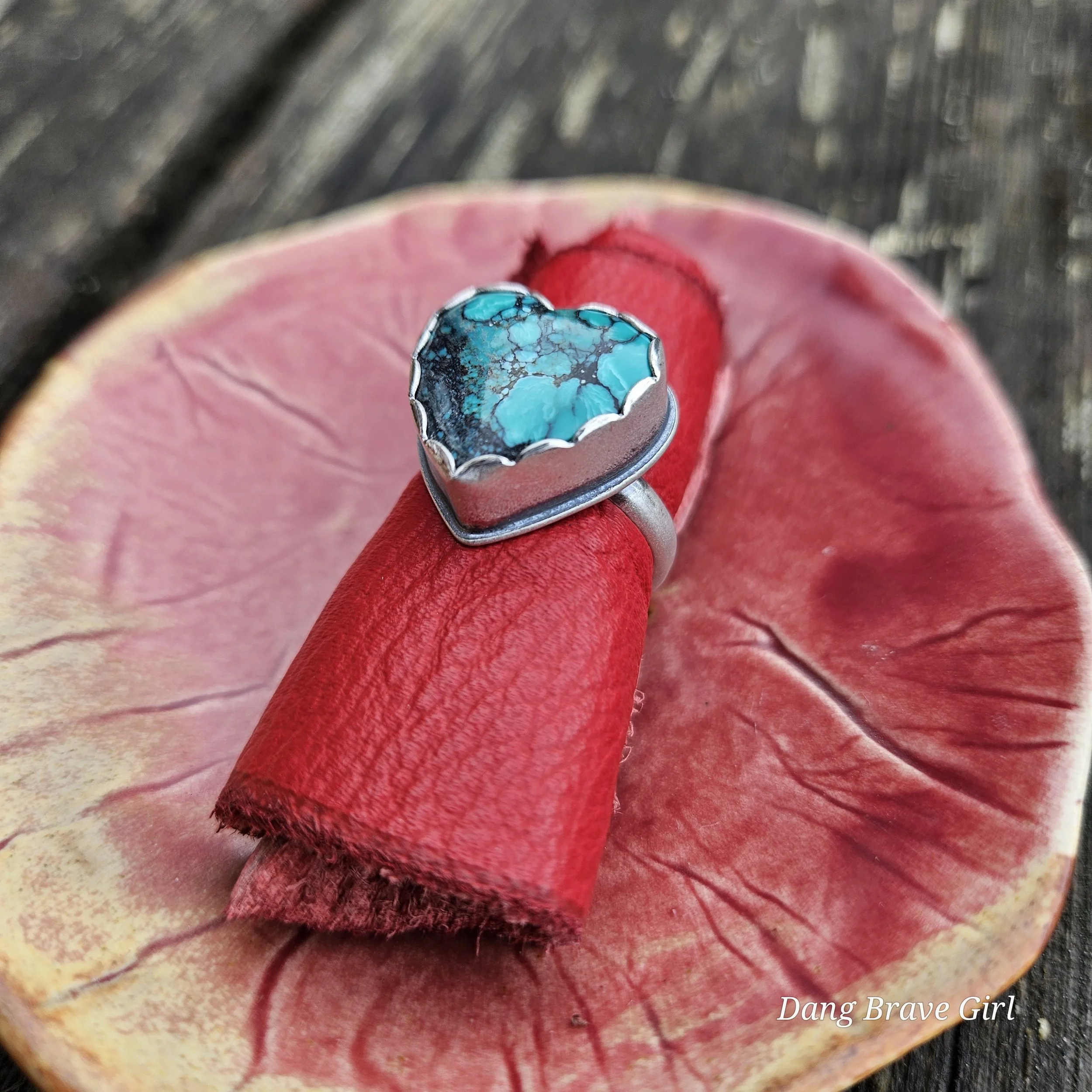 This chunky Hubei Turquoise heart has a home in fine and sterling silver, with a comfortable band, made in a size 6.5.
