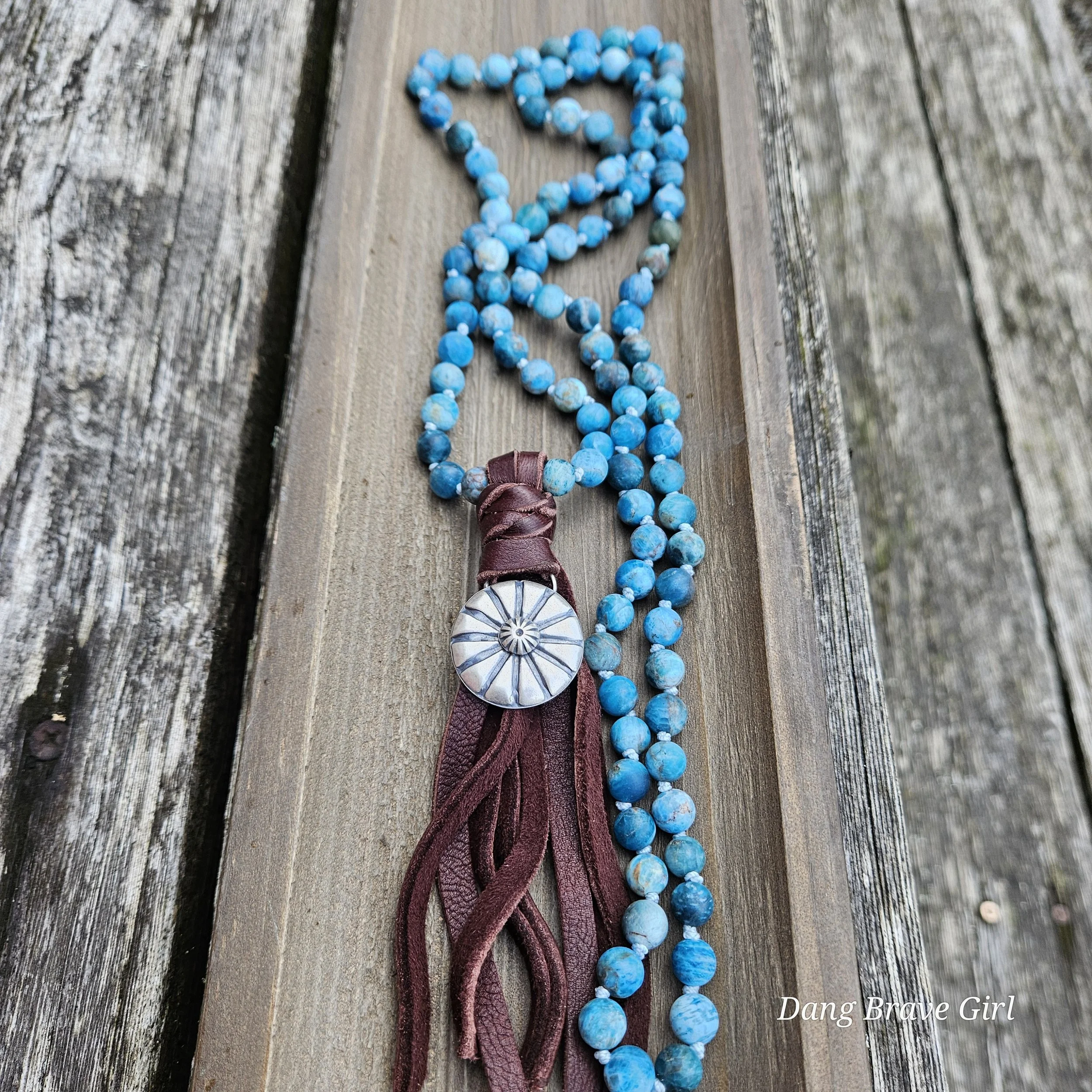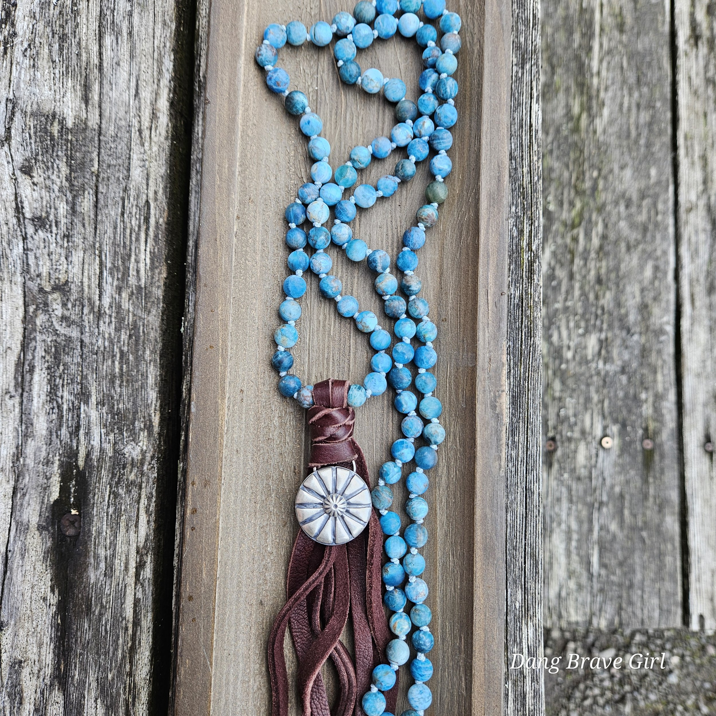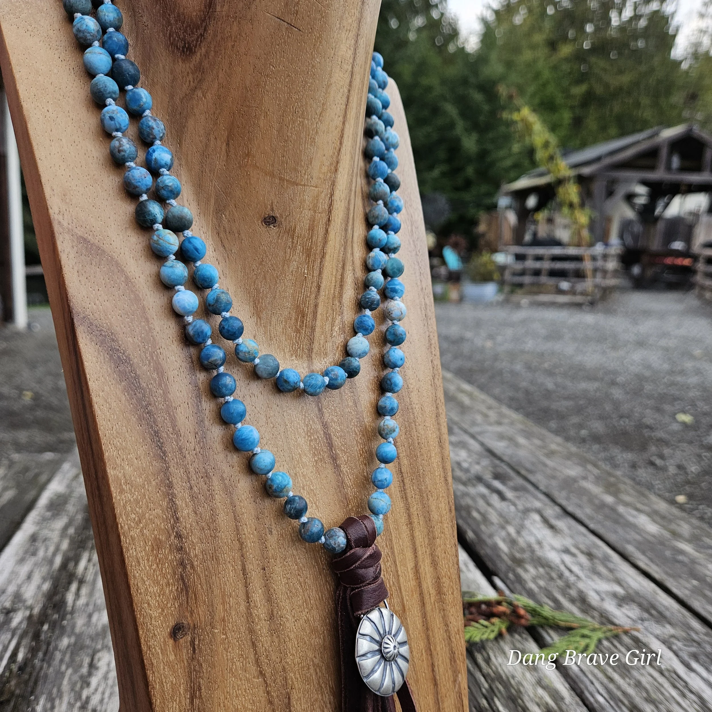Traditionally made with 108 8mm matte beads, this mala is hand knotted and complimented by a focal pendant and leather tassel, all handmade.