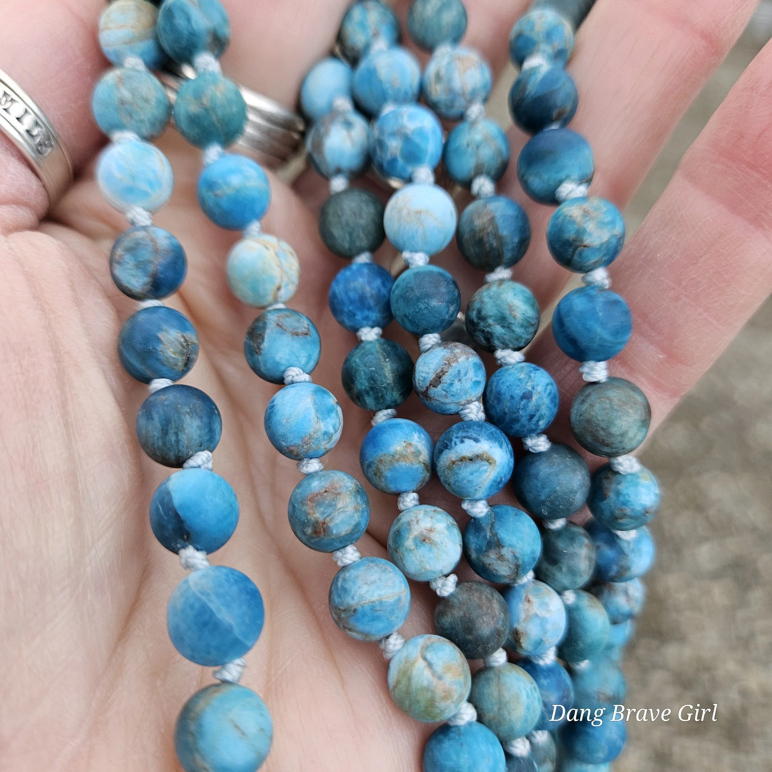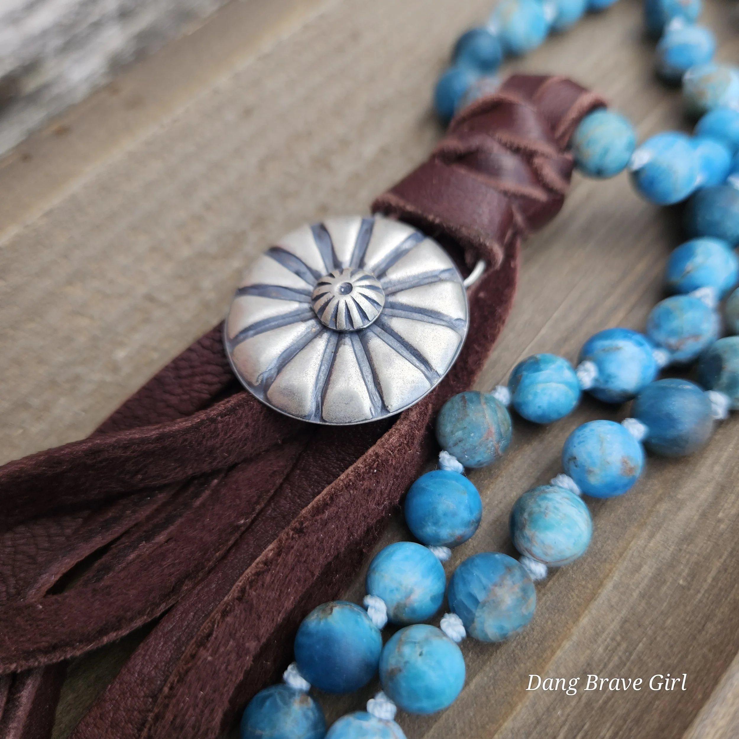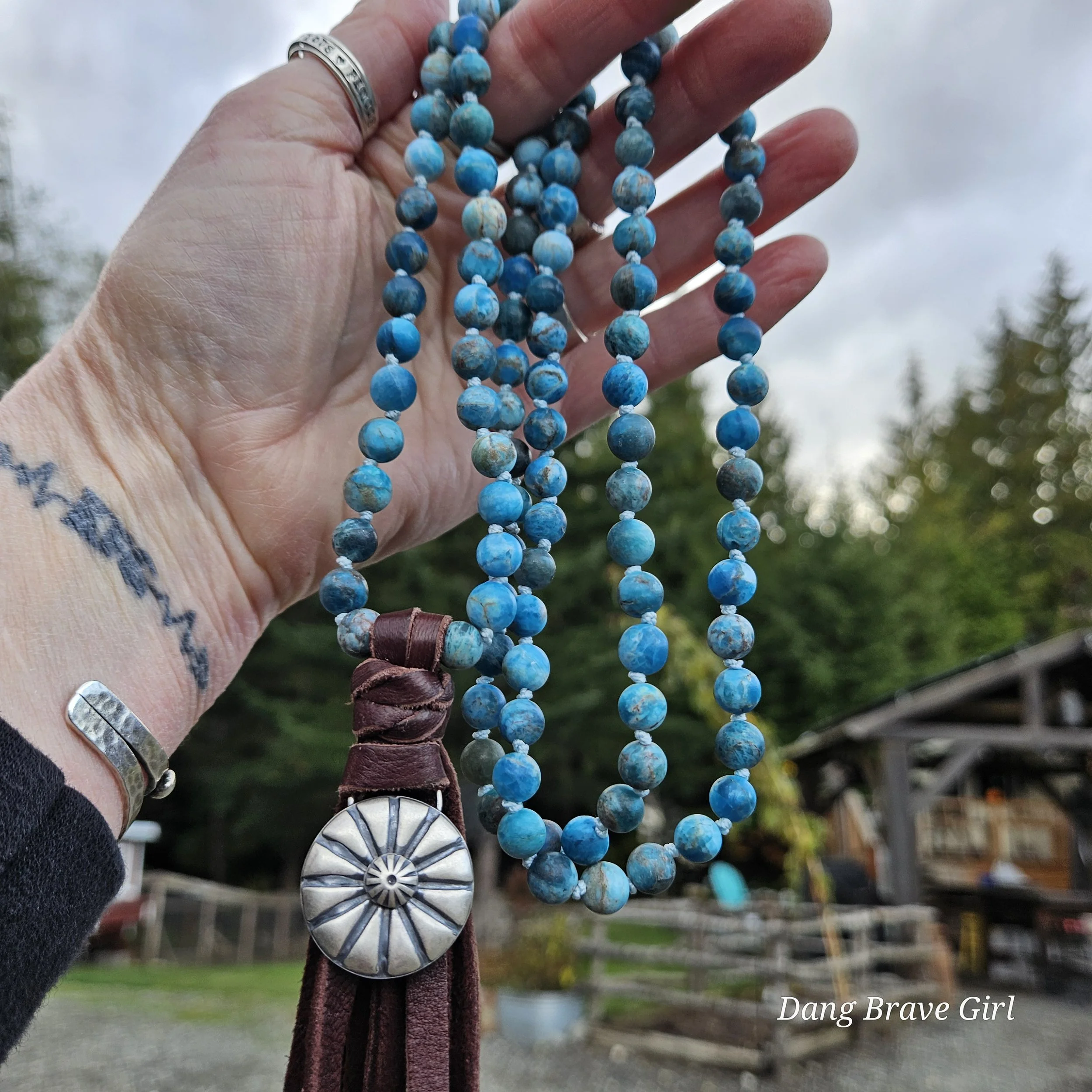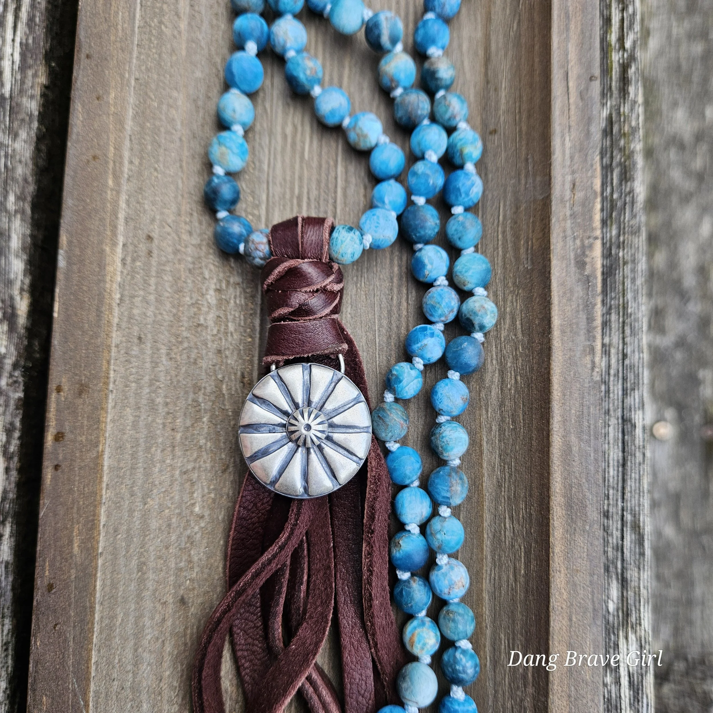 Traditionally made with 108 8mm matte beads, this mala is hand knotted and complimented by a focal pendant and leather tassel, all handmade.