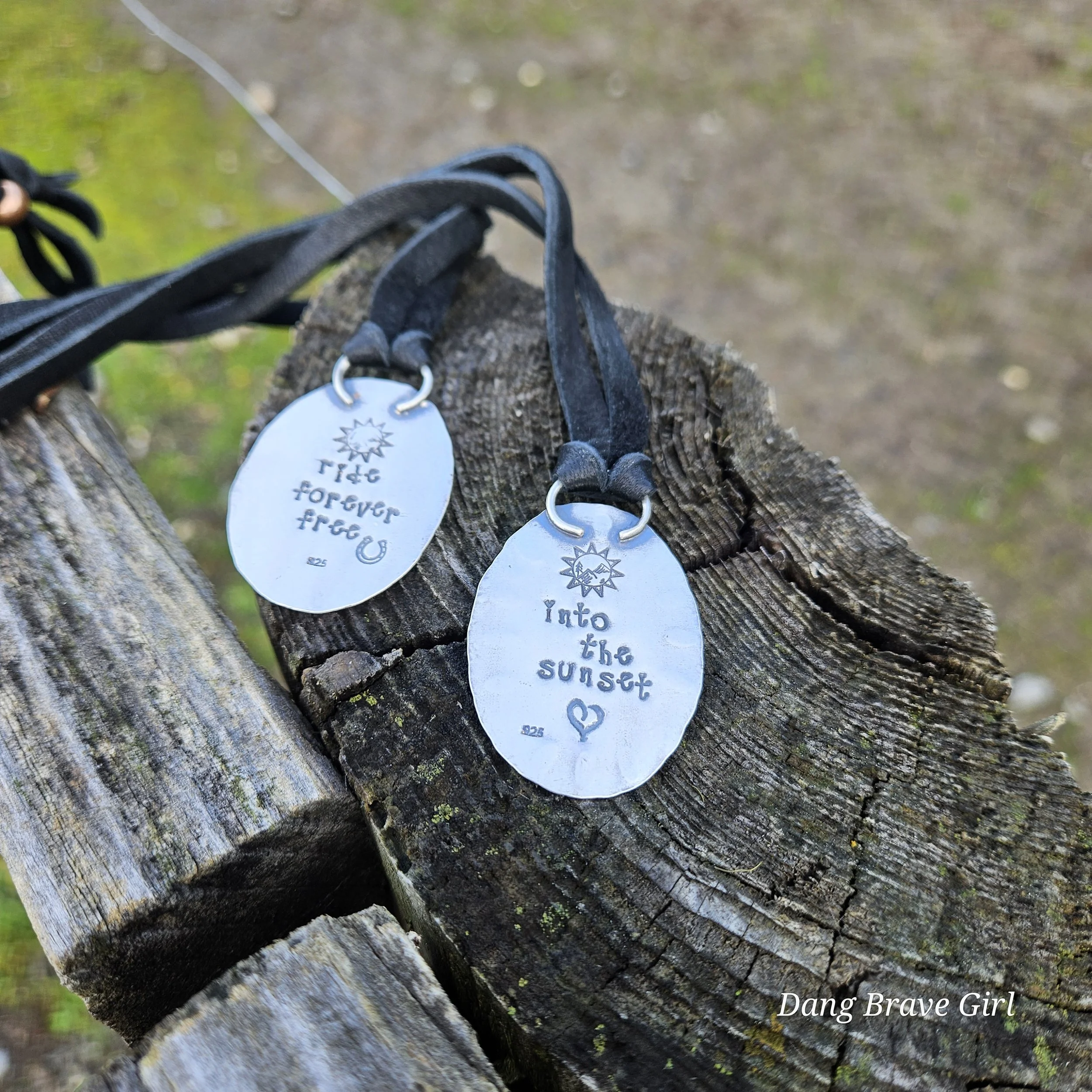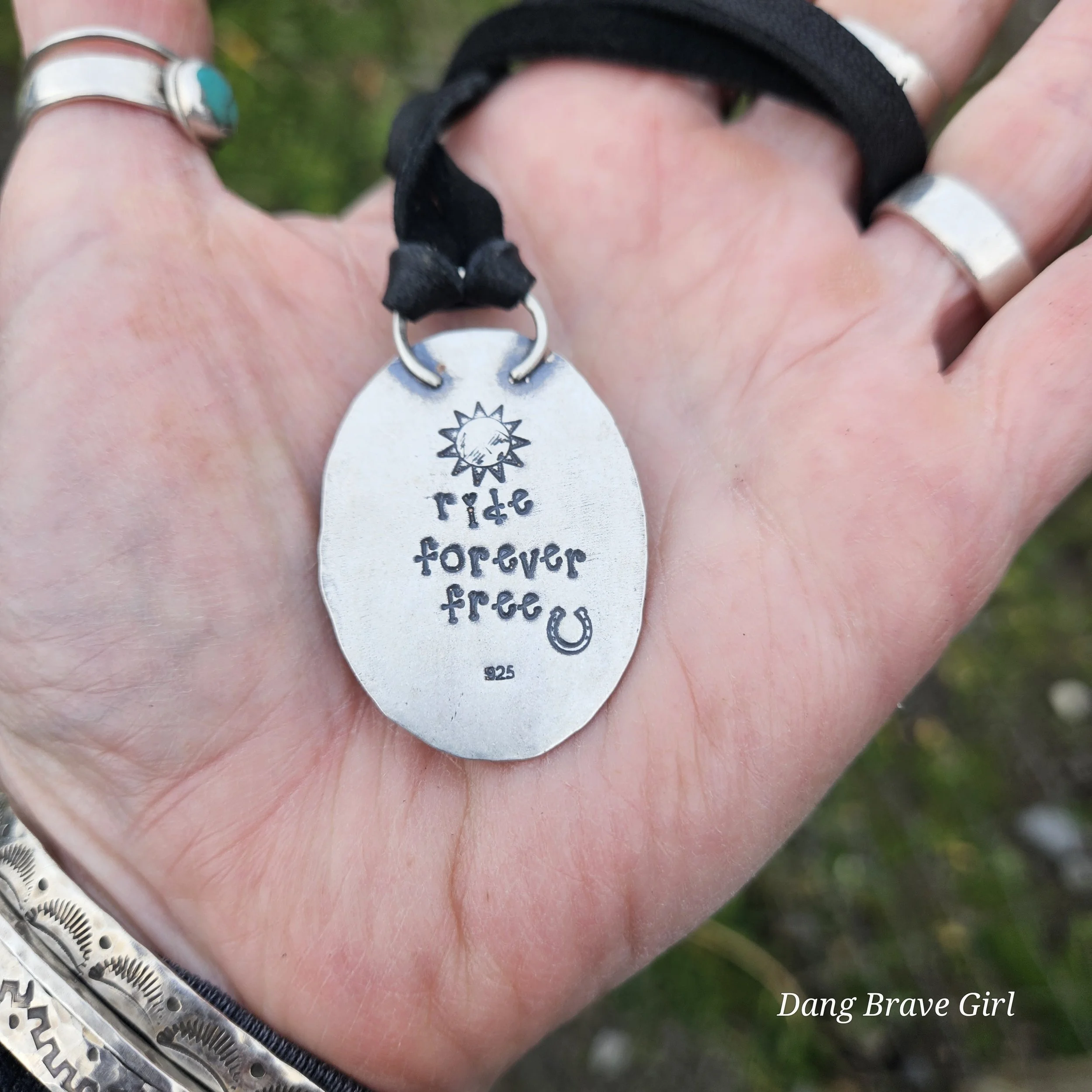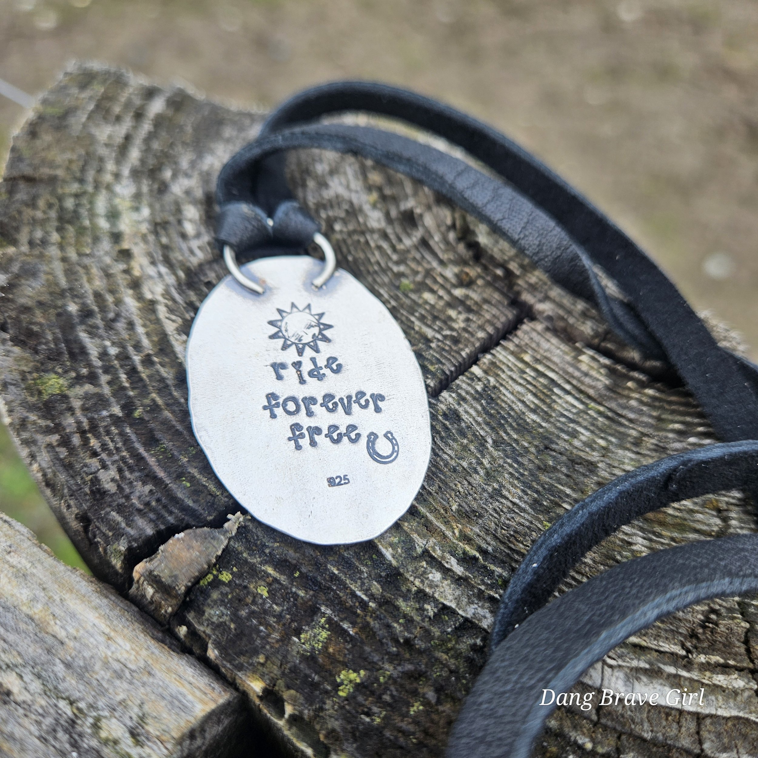 This pendant has two layers of sterling silver, the top one detailed with a horse and the bottom back with the sentiment. It’s finished with a rich patina and soft polish.