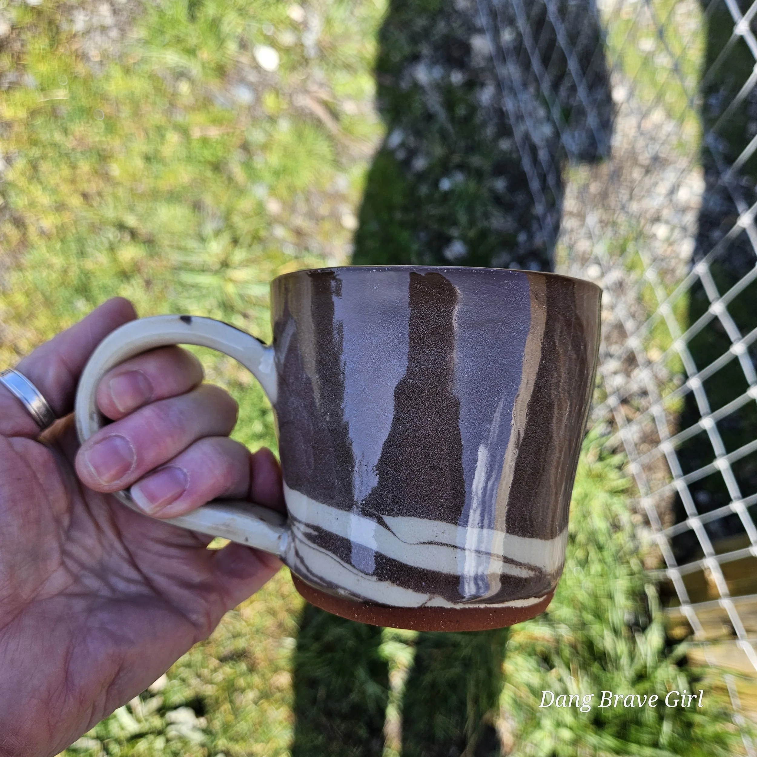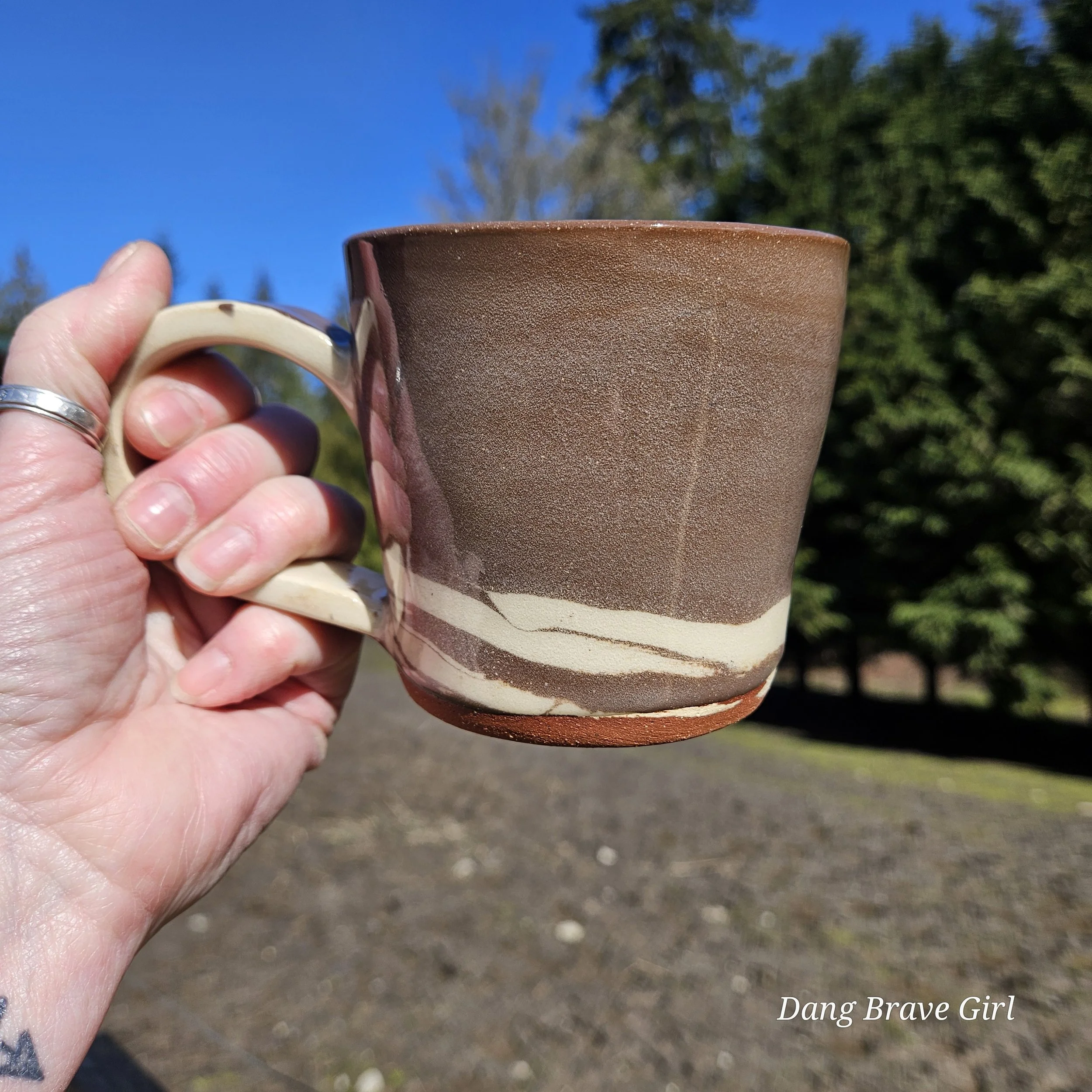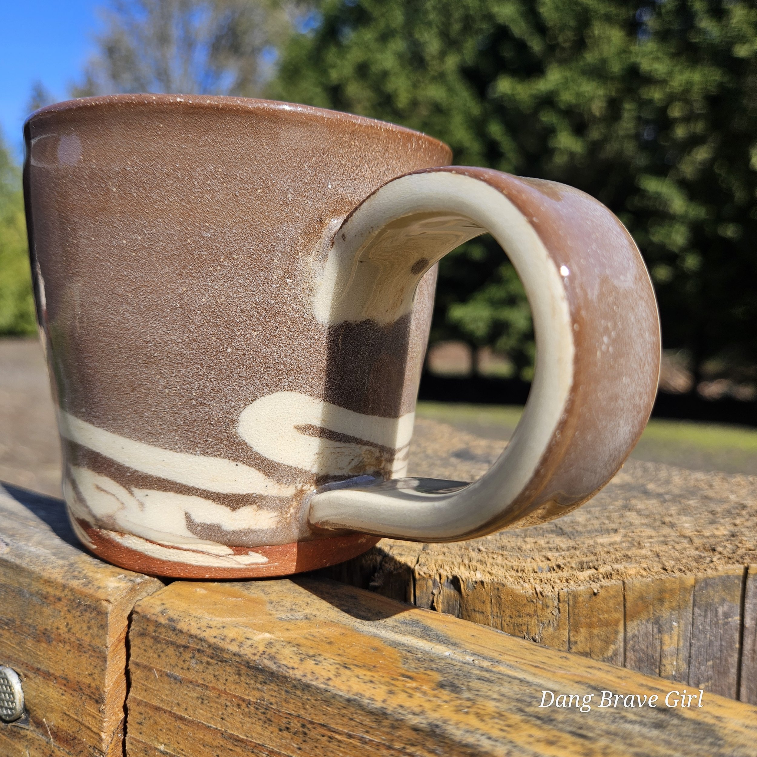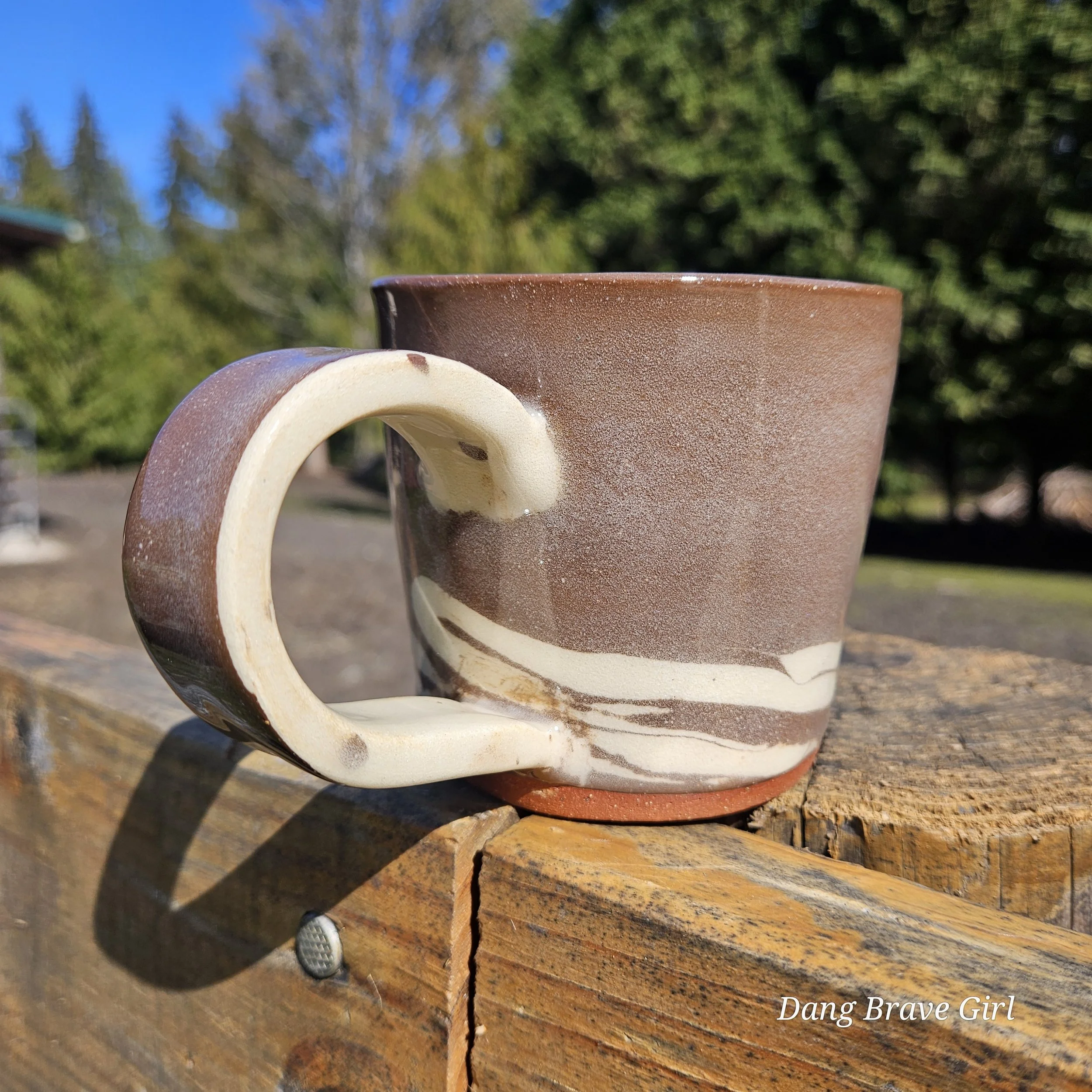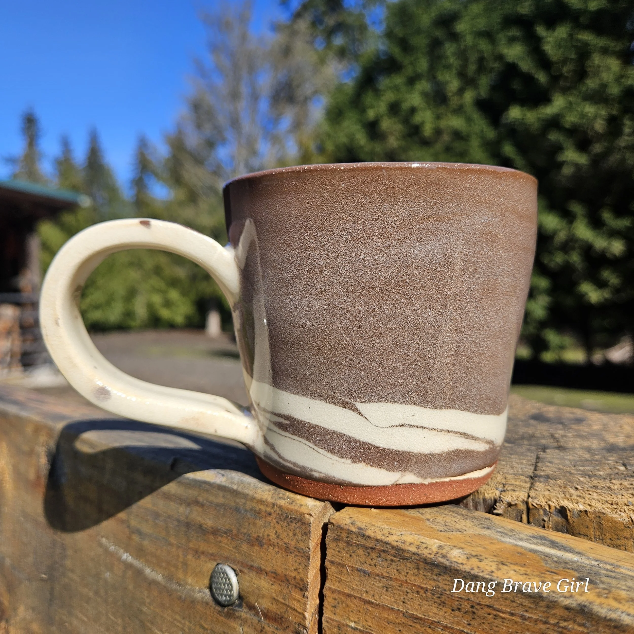 Handmade by the DBH with both Oregon Red clay and a creamy stoneware! The process of blending them while on the wheel is pretty cool and each one turned out different. A comfortable, sturdy handle and clear glaze completes this ooak mug.