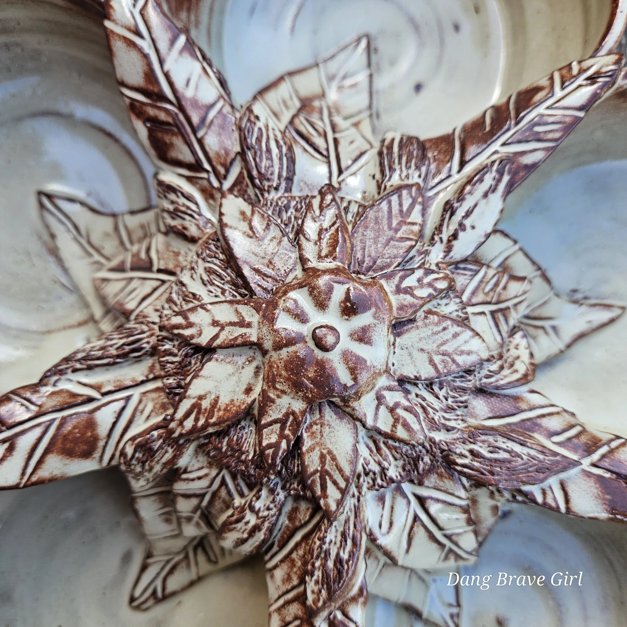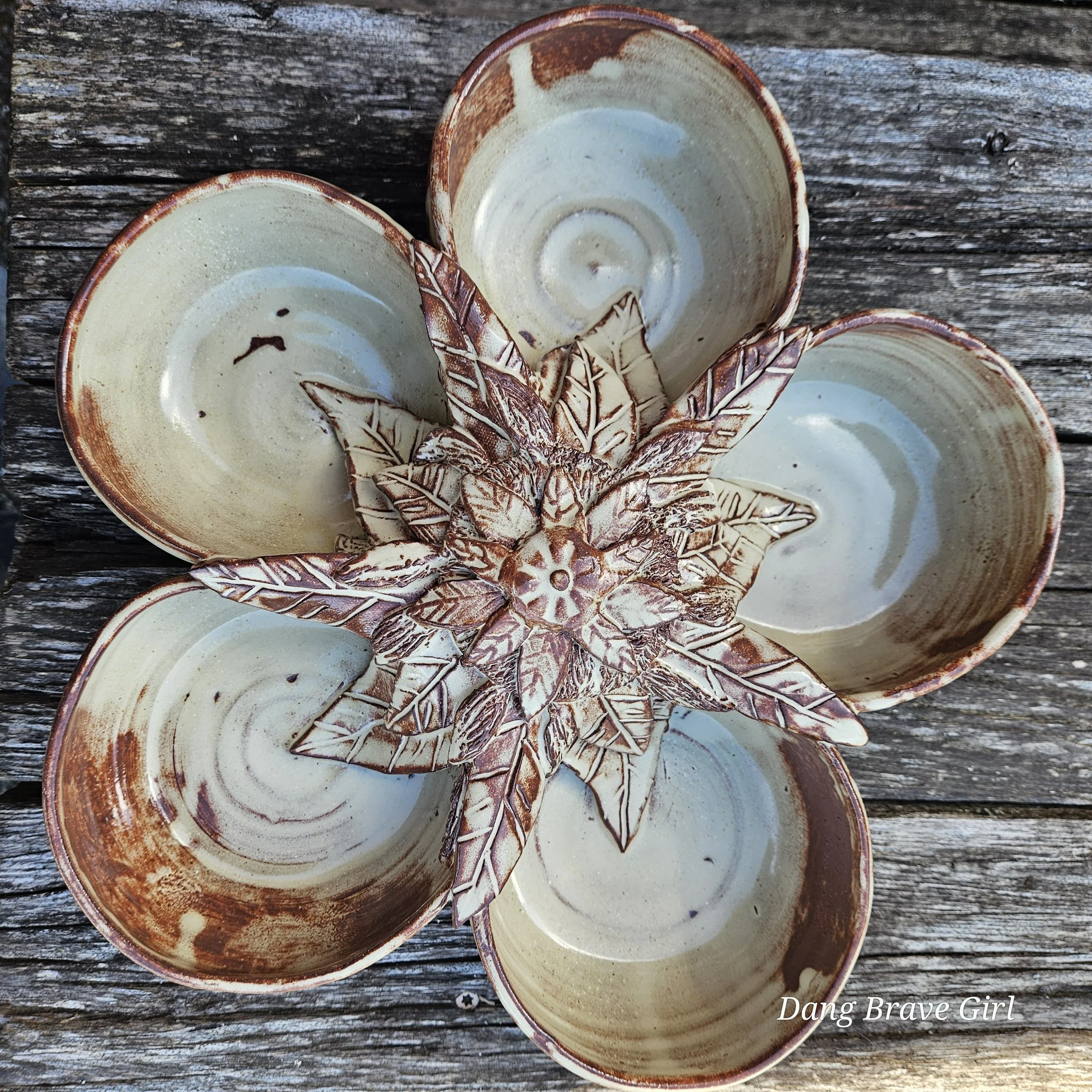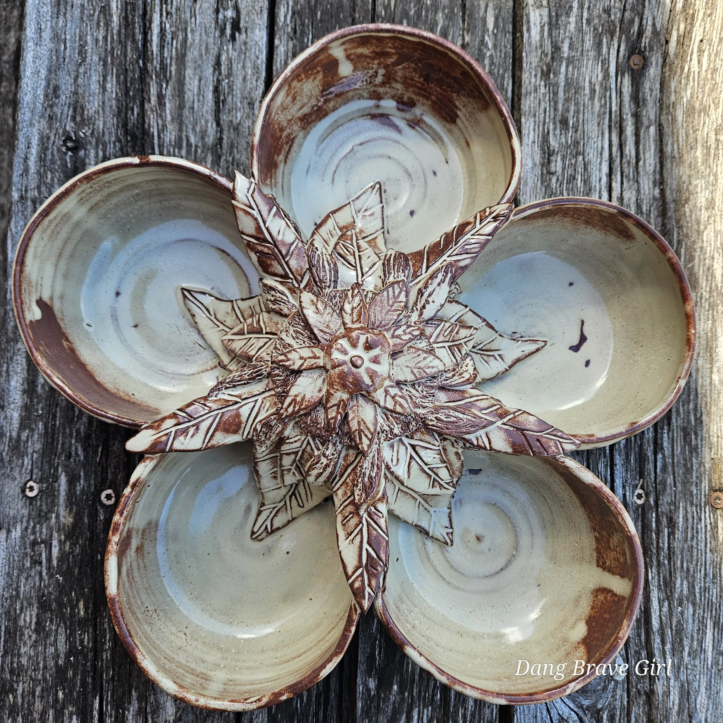 Handmade by the DBH with Oregon Red clay, this large 5 bowl serving dish is absolutely incredible with one of his signature sunflowers in the center. Layers of detailed petals draping into each bowl…it’s just gorgeous. Even more so when it’s all highlighted by that Stellar Rust glaze.