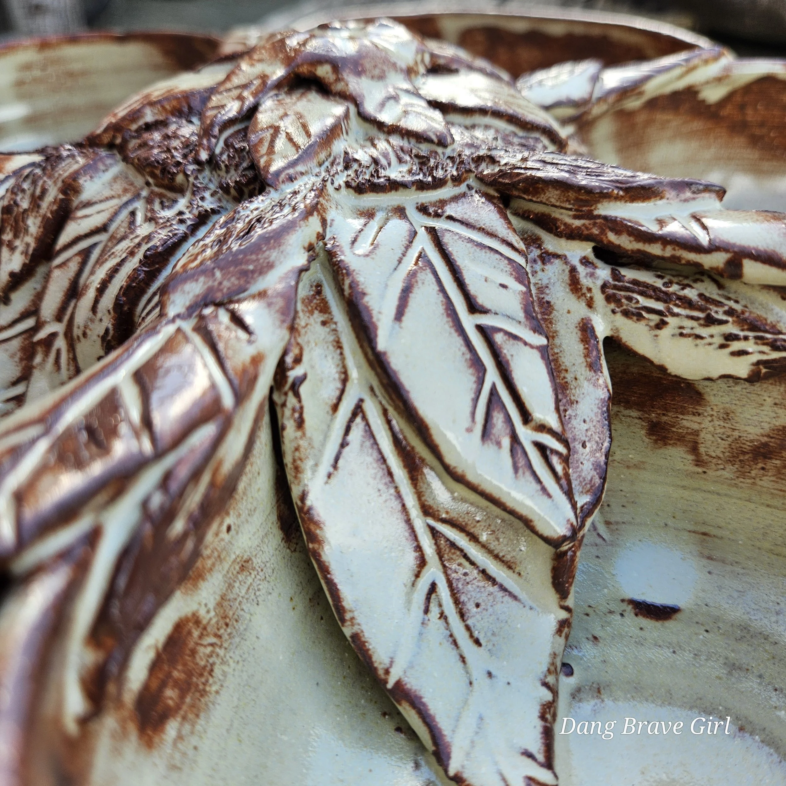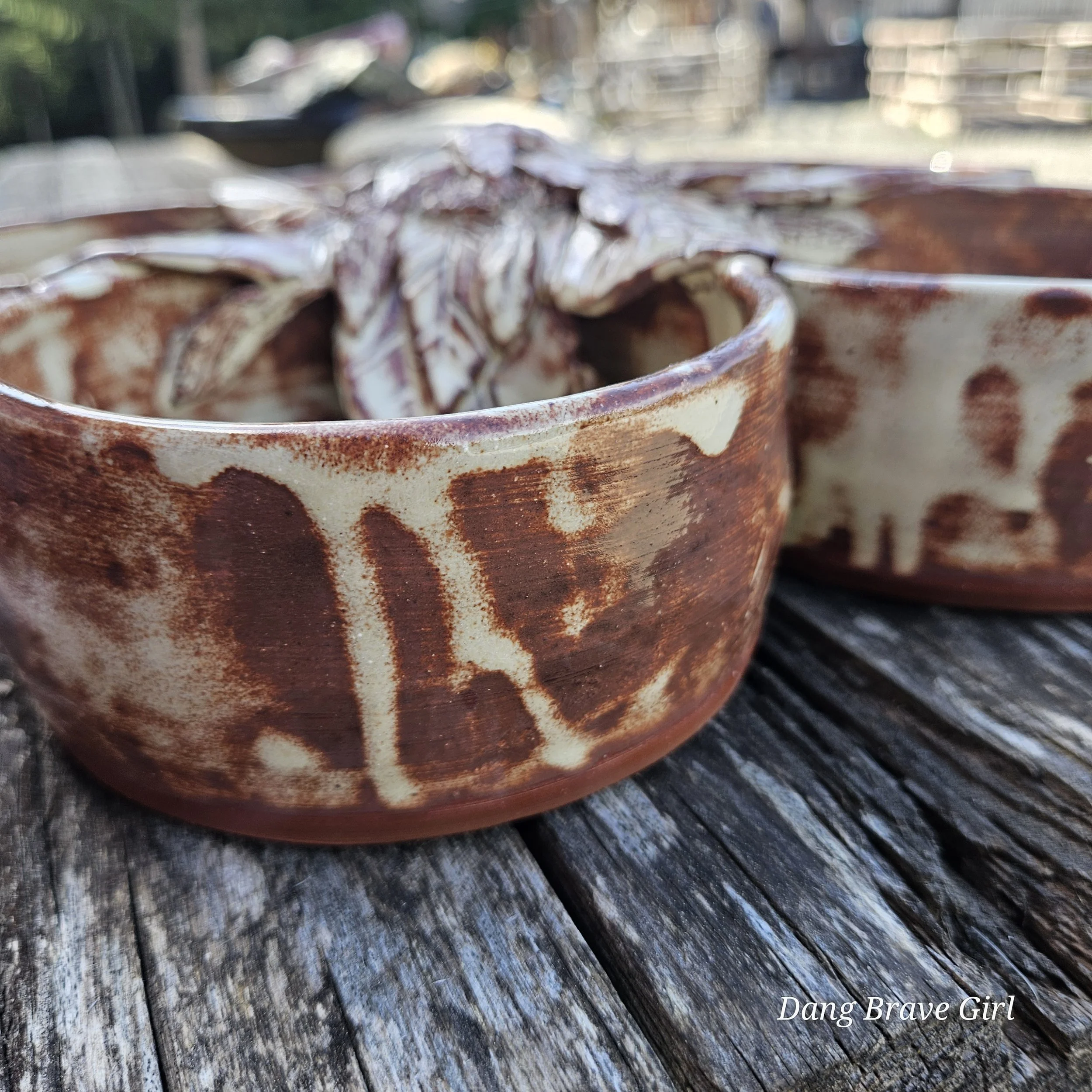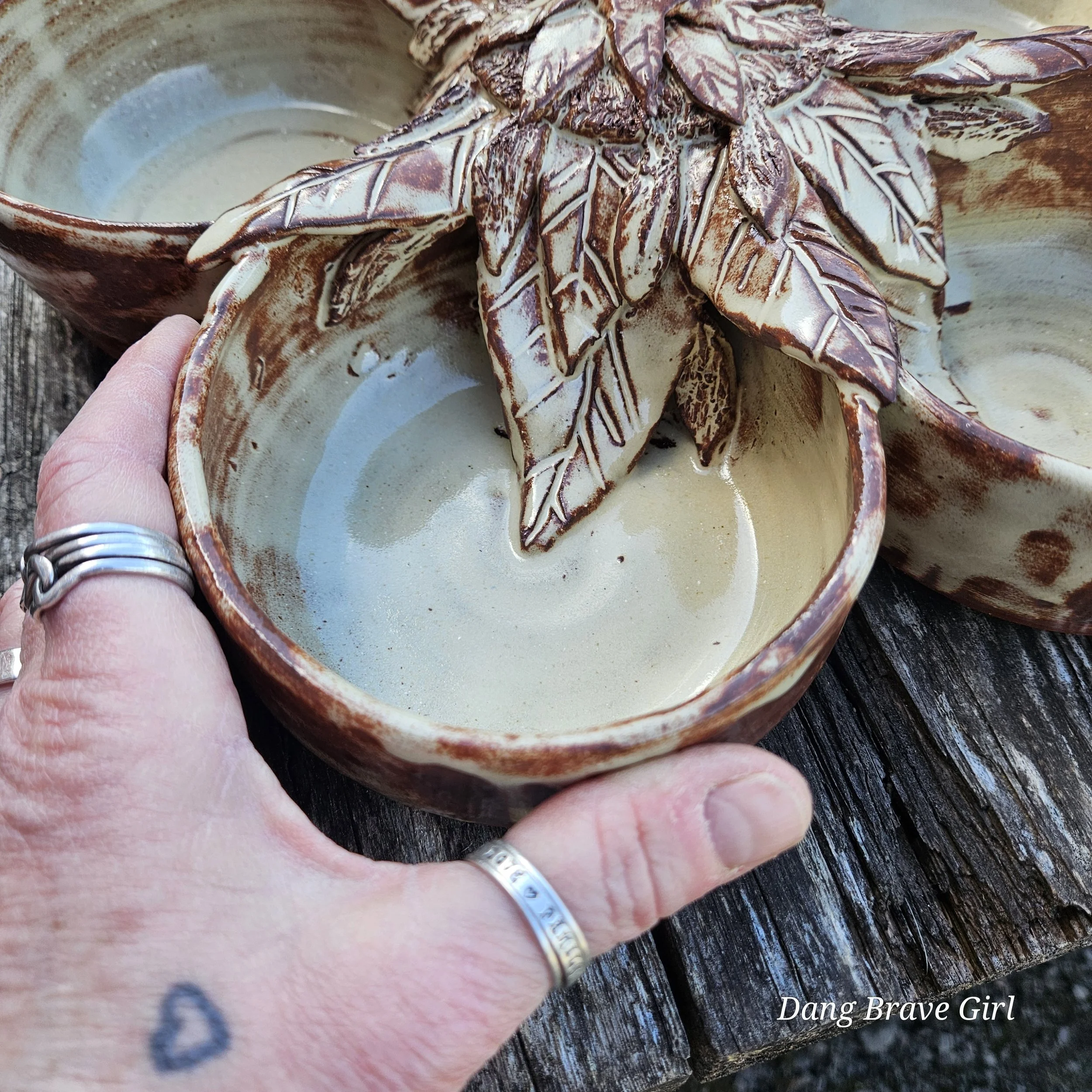 Handmade by the DBH with Oregon Red clay, this large 5 bowl serving dish is absolutely incredible with one of his signature sunflowers in the center. Layers of detailed petals draping into each bowl…it’s just gorgeous. Even more so when it’s all highlighted by that Stellar Rust glaze.
